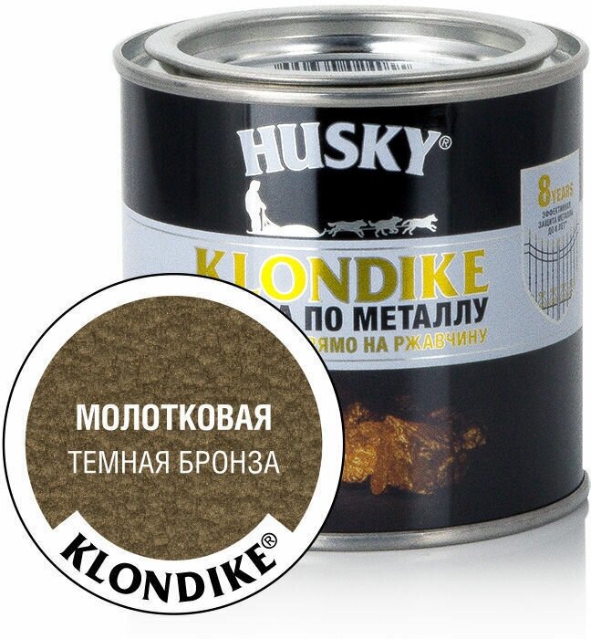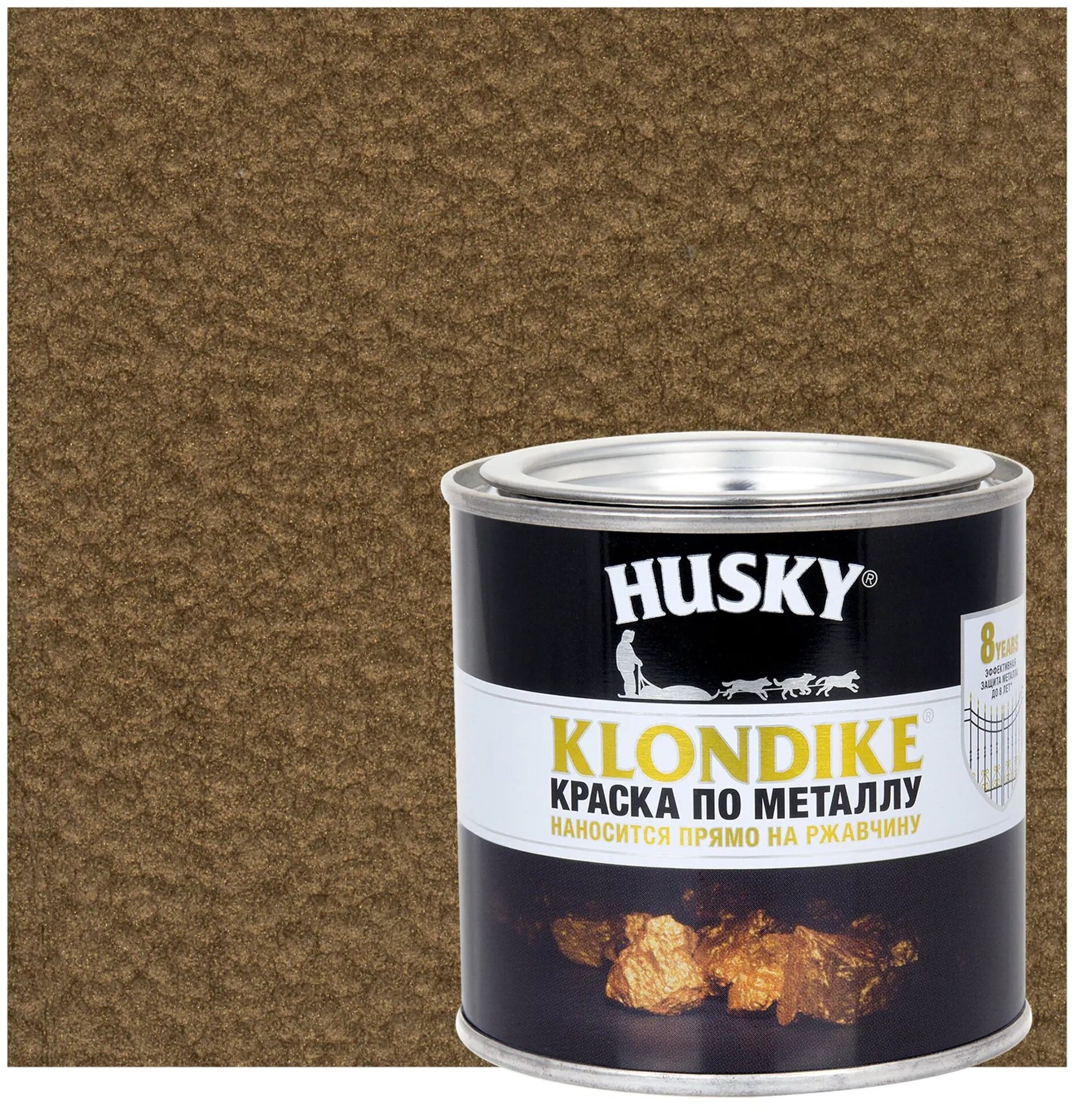 **Краска Husky Klondike** - продукция темно-зеленого цвета (RAL), особенность которой заключается в том, что ее можно наносить прямо на покрытые ржавчиной участки. Идеально подходит для любых металлических поверхностей - можно наносить как внутри, так и снаружи помещения. Формирует прочное антикоррозионное и атмосферостойкое покрытие. Включает в себя преобразователь ржавчины, грунтовку и финишное покрытие. Состоит из таких компонентов, как дезодорированный растворитель, полимерное связующее, антикоррозионные пигменты, добавки и ингибитор коррозии. Перед нанесением необходимо очистить, высушить и обезжирить поверхность. Старое лакокрасочное покрытие, окалину и рыхлую ржавчину нужно тщательно удалить. Если основание выполнено из цветного металла или поверхность гальванизированная, то требуется воспользоваться грунтовкой. Краску необходимо тщательно перемешать. Наносить ее нужно в 2 слоя - для этого можно использовать кисть, малярный валик или метод распыления. Рекомендуемая температура при проведении работ от +5°C до +30°C. Не следует окрашивать в дождь.