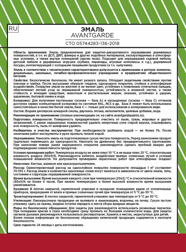 **Эмаль AvantGarde база А** - состав белого цвета, предназначенный для создания защитно-декоративного глянцевого слоя на деревянных поверхностях, в том числе из фанеры, ДСП и ДВП. Также подходит для других похожих материалов. Может применяться внутри и снаружи помещения. Широко используется для окрашивания детской и садовой мебели, деревянных игрушек и посуды. Продукт экологически безопасен, без сильного запаха. Покрытие со временем не желтеет и не меняет цвет. Устойчивость к появлению отпечатков пальцев упрощает уход за обработанным покрытием. Возможна колеровка. Эмаль изготовлена из водной дисперсии алкидной смолы, двуокиси титана, наполнителей, целевых добавок и воды. Поверхность нужно предварительно очистить от грязи, пыли и прочих загрязнений. Перед нанесением состав нужно перемешать до получения однородности. Наносить на деревянное основание без предварительного грунтования.
