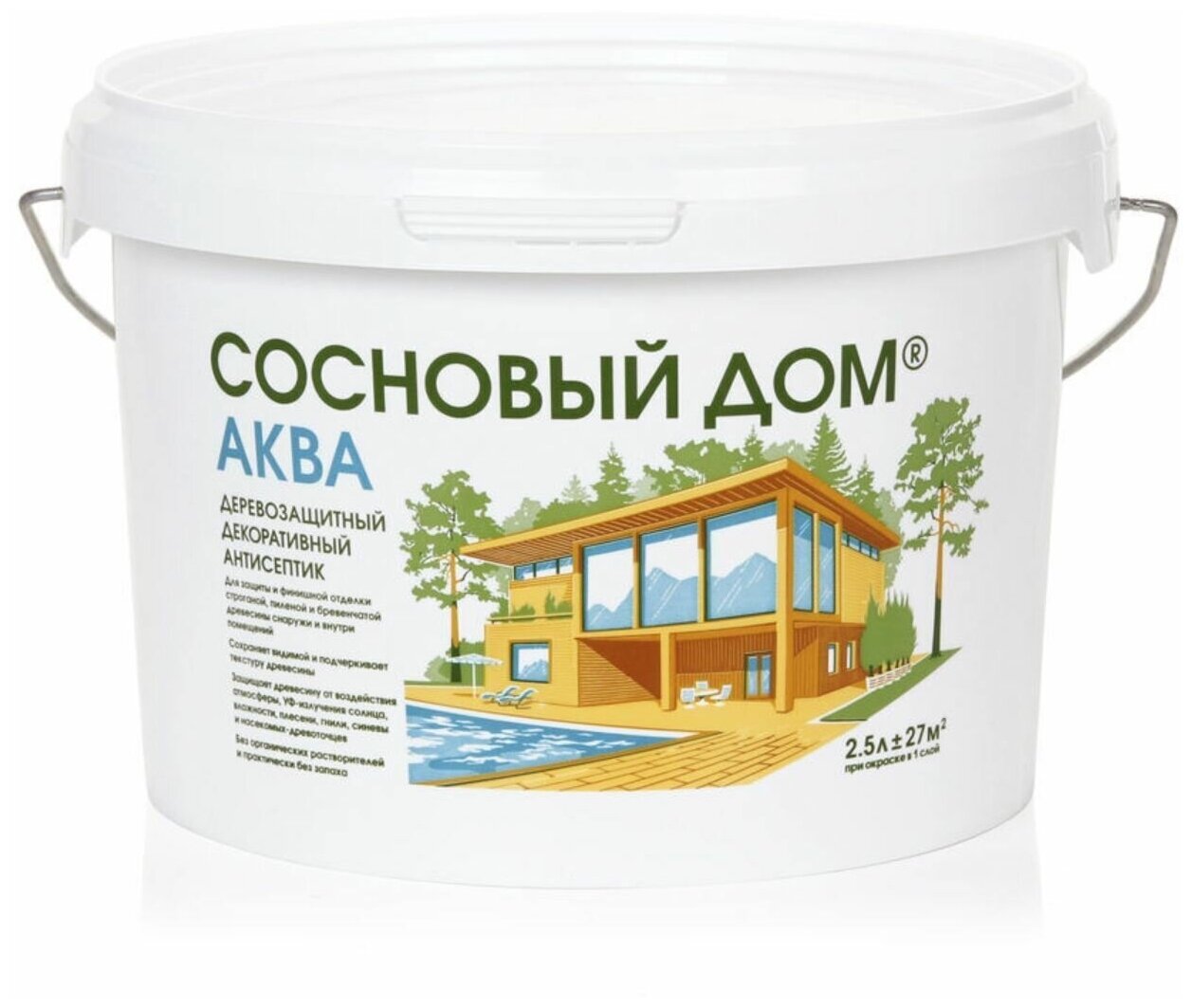 **Декоративный антисептик для дерева «Сосновый Дом» Аква** — лессирующий защитно-декоративный антисептик на акриловом связующем для финишной отделки строганой, пиленой и бревенчатой древесины снаружи и внутри помещений. Без органических растворителей и практически без запаха. Основная область применения — фасады деревянных зданий, стены и потолки внутри помещений, беседки, заборы, мебель, другие конструкции из строганой, пиленой и бревенчатой древесины. Страна производства — Россия.