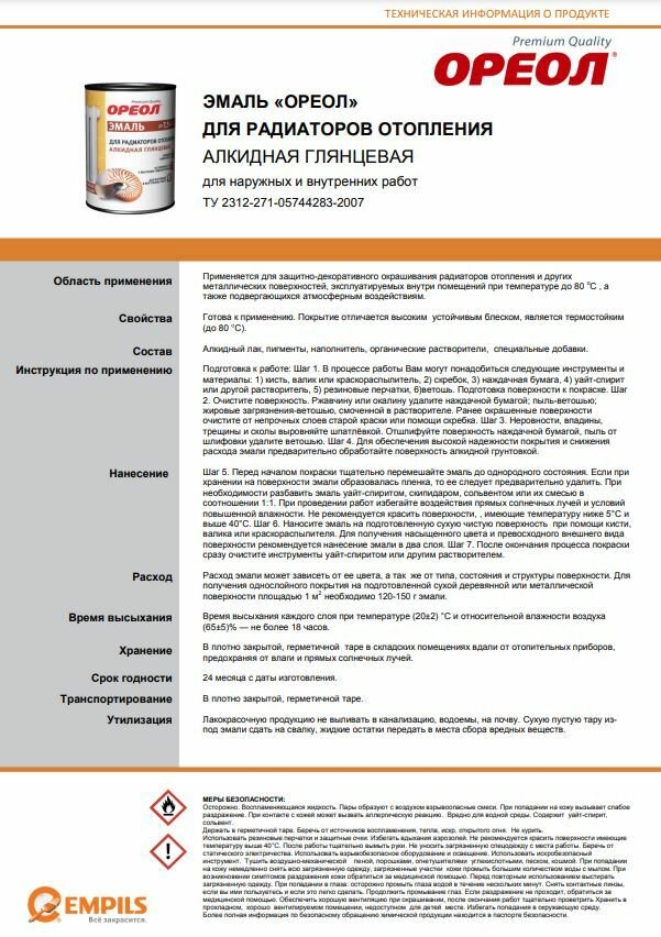 **Эмаль алкидная Ореол** - термостойкий состав, предназначенный для внутренних и наружных работ. Позволяет сформировать глянцевое защитно-декоративное покрытие на радиаторах отопительных систем и прочих металлических поверхностях. Состоит из алкидного лака, пигментов, наполнителей, органических растворителей и специальных добавок. Продукция готова к использованию и не требует разведения. Перед использованием необходимо очистить поверхность, удалив пыль, грязь, ржавчину и окалину. С ранее окрашенного основания необходимо удалить непрочные слои старой краски.