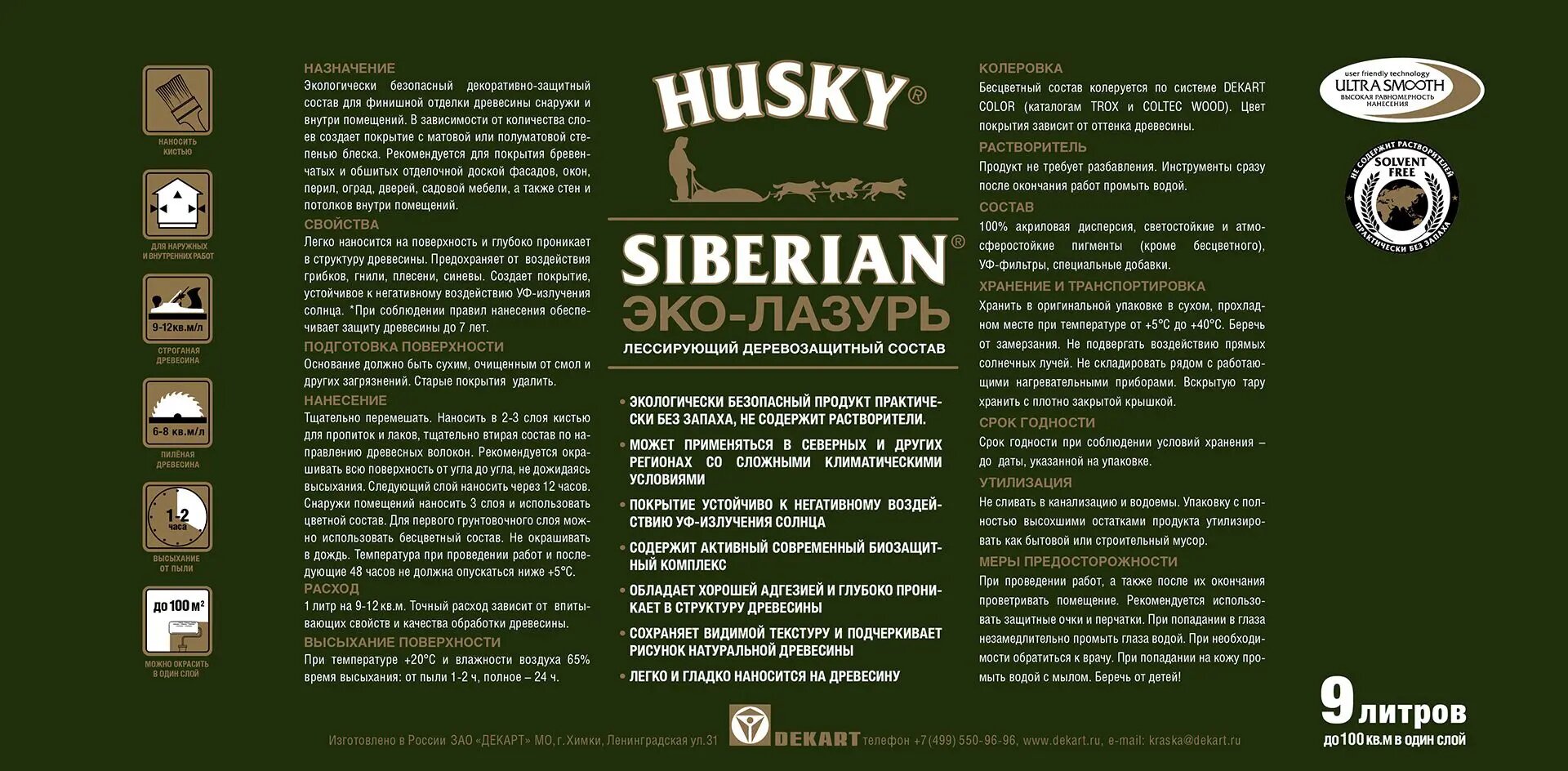 **Эко-лазурь для дерева Husky Siberian** — 100% акриловый полупрозрачный антисептик для долговечной защиты древесины. Применяется для защитно-декоративной окраски древесины снаружи и внутри помещений. Основная область применения — фасады деревянных зданий, стены и потолки внутри помещений, беседки, заборы, мебель, другие конструкции из строганой, пиленой и бревенчатой древесины. Легко наносится на поверхность и глубоко проникает в структуру древесины. Предохраняет от воздействия грибков, гнили, плесени, синевы. Создает покрытие, устойчивое к негативному воздействию УФ-излучения солнца. Не содержит растворителей и практически не пахнет. Страна производства — Россия.