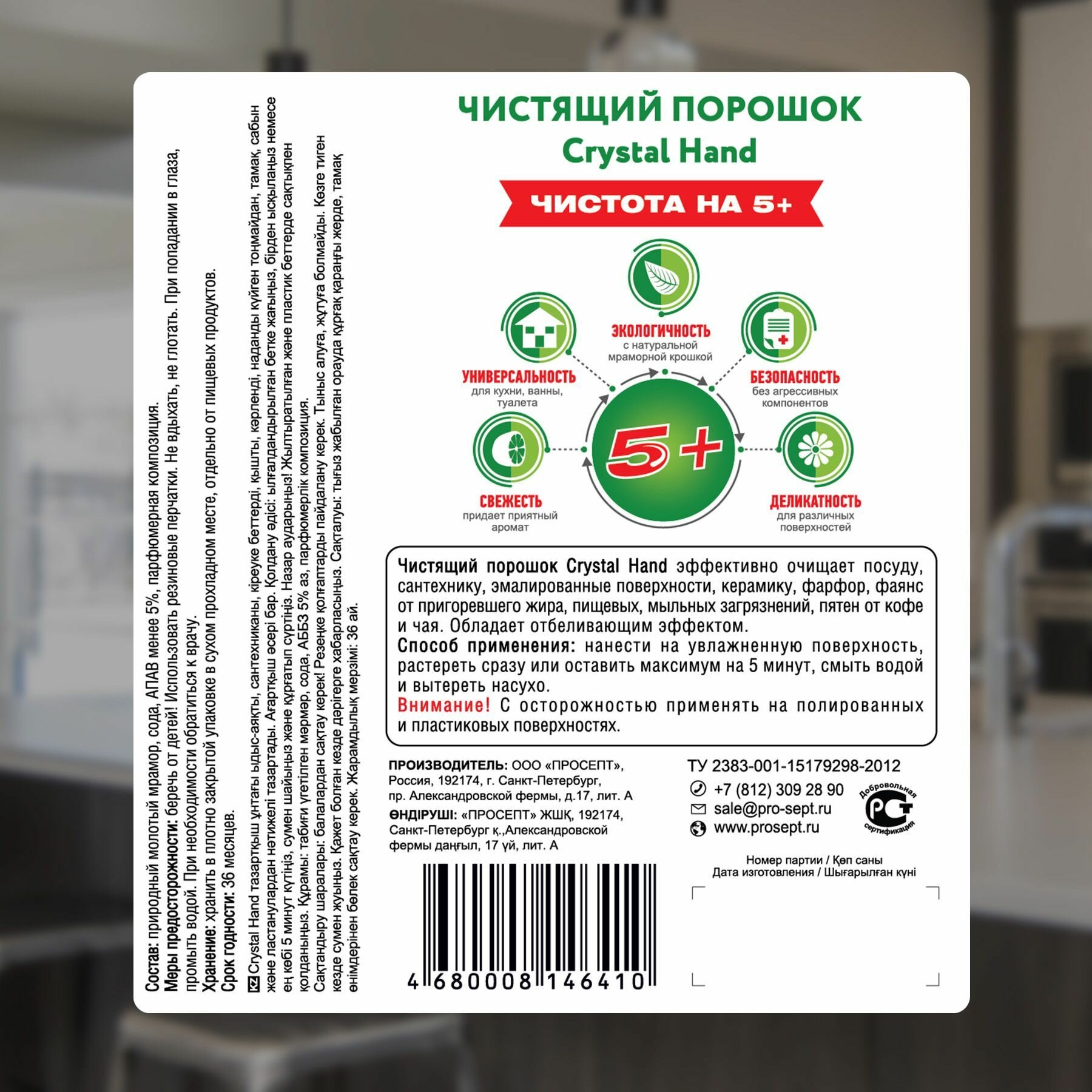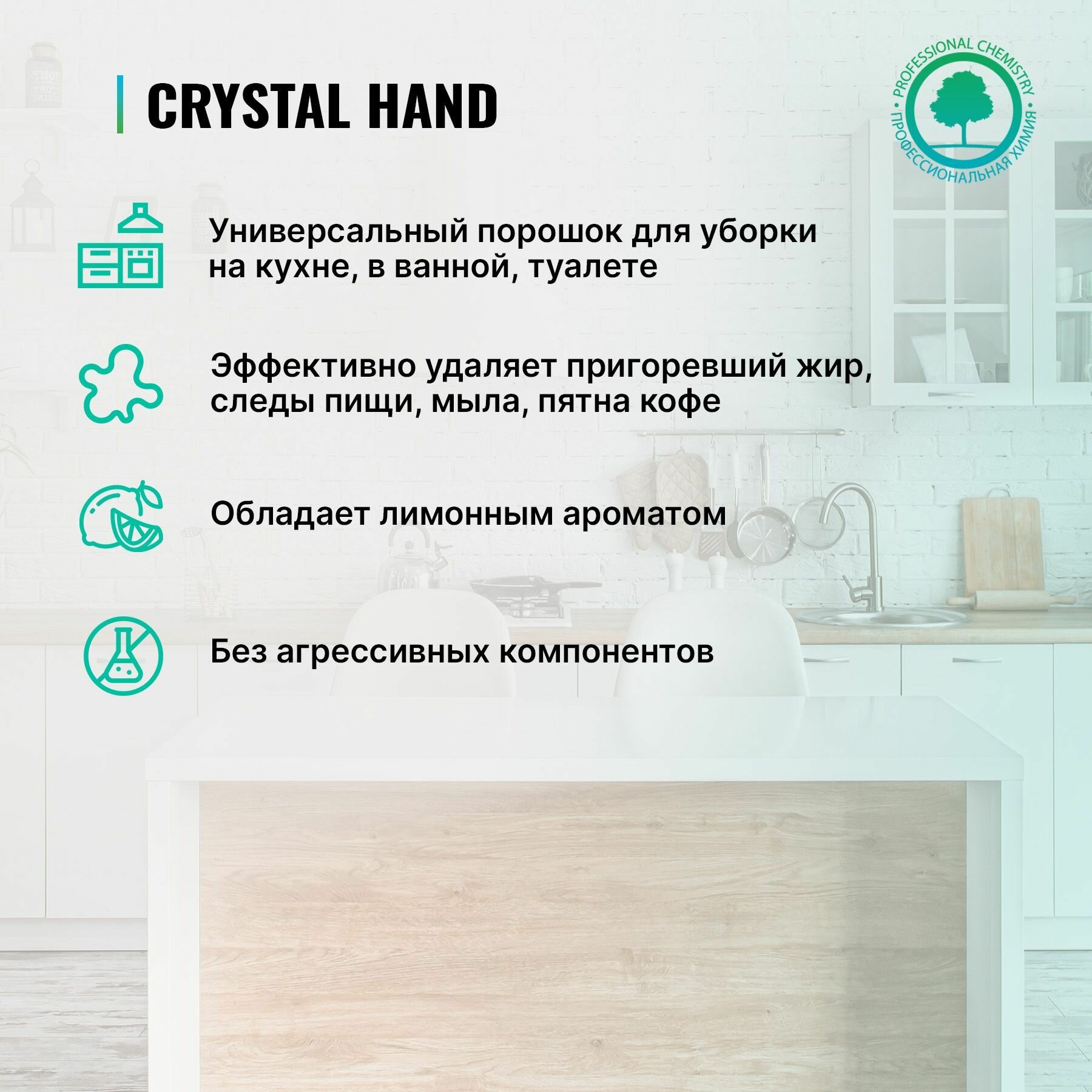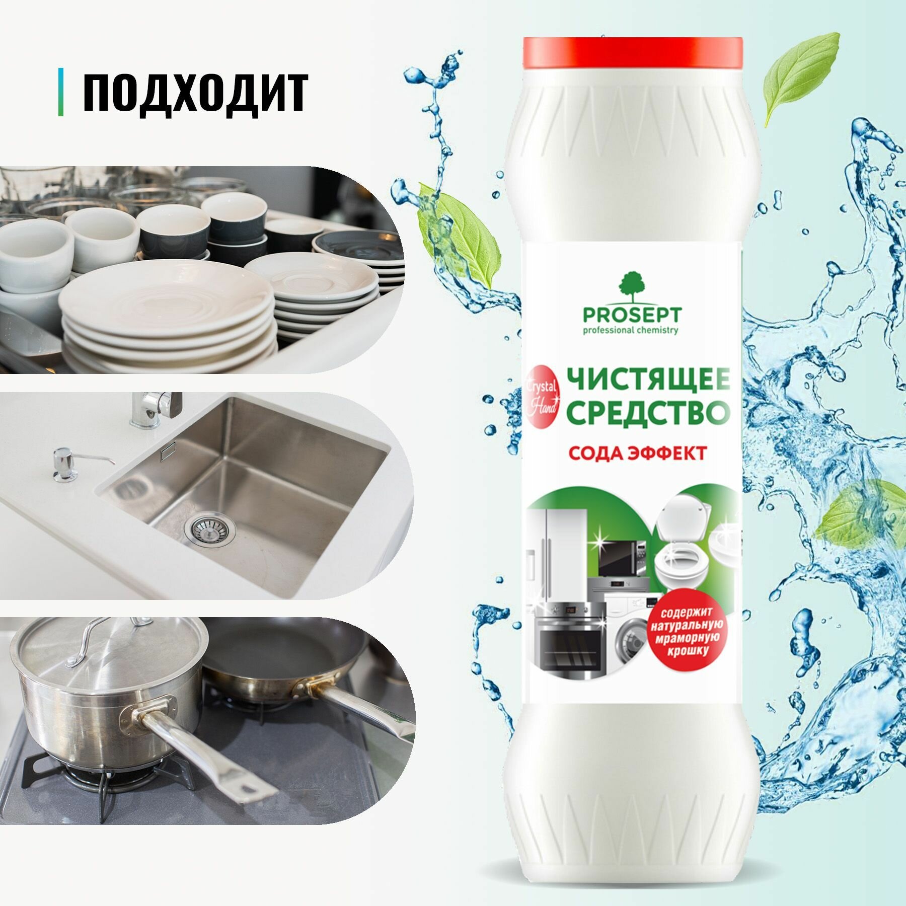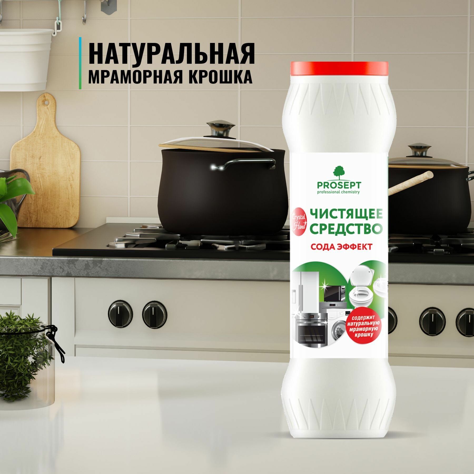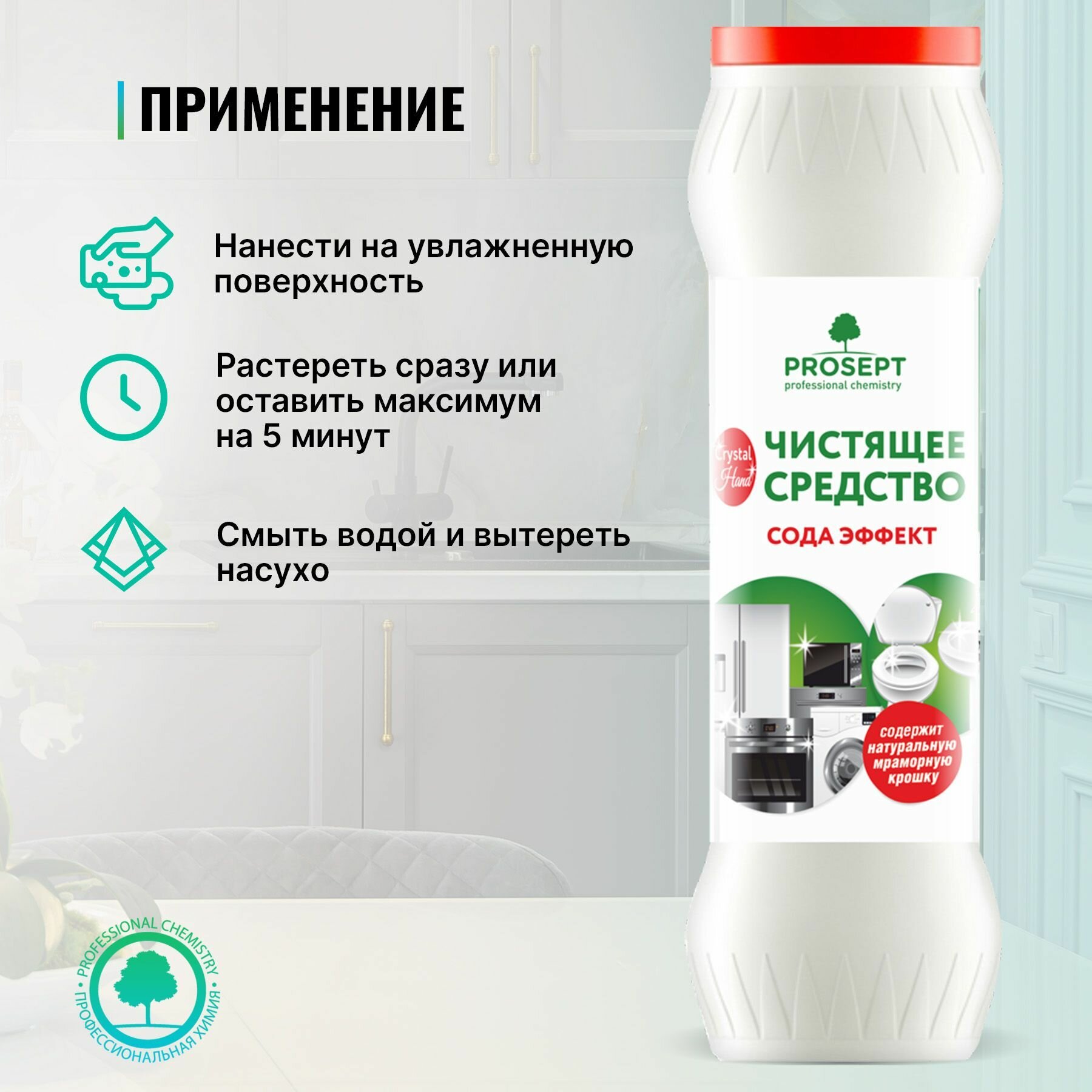 **Чистящий порошок Prosept «Crystal Hand»** – абразивное средство для очищения посуды, сантехники, эмалированных поверхностей, керамики, фарфора и фаянса от пригоревшего жира, пищевых, мыльных и прочих загрязнений.