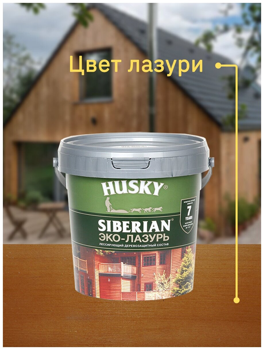 **Эко-лазурь для дерева Husky Siberian** — 100% акриловый полупрозрачный антисептик для долговечной защиты древесины. Применяется для защитно-декоративной окраски древесины снаружи и внутри помещений. Основная область применения — фасады деревянных зданий, стены и потолки внутри помещений, беседки, заборы, мебель, другие конструкции из строганой, пиленой и бревенчатой древесины. Легко наносится на поверхность и глубоко проникает в структуру древесины. Предохраняет от воздействия грибков, гнили, плесени, синевы. Создает покрытие, устойчивое к негативному воздействию УФ-излучения солнца. Не содержит растворителей и практически не пахнет. Страна производства — Россия.