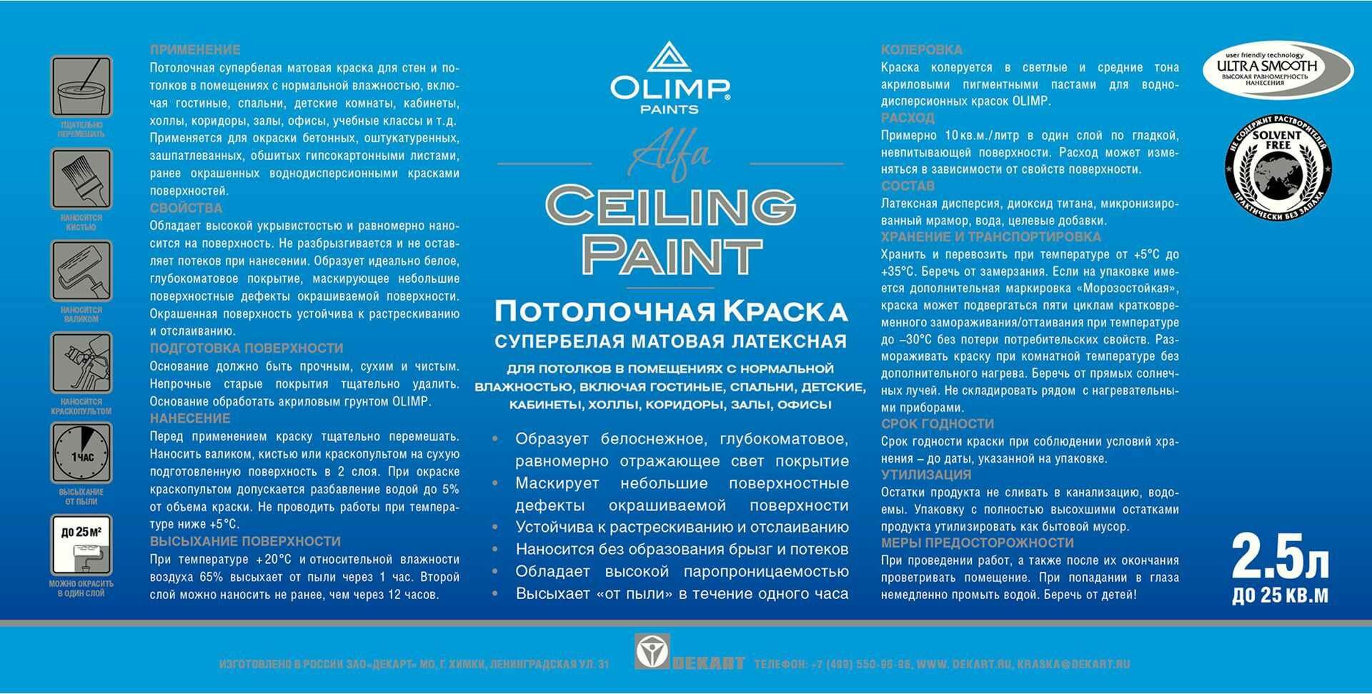 **Супербелая потолочная краска Olimp Альфа** — глубокоматовая латексная акриловая краска для потолков в помещениях с нормальной влажностью. Образует белоснежное, равномерно отражающее свет покрытие. Маскирует небольшие поверхностные дефекты окрашиваемой поверхности. Краска устойчива к растрескиванию и отслаиванию. Обладает высокой паропроницаемостью. Страна производства — Россия.