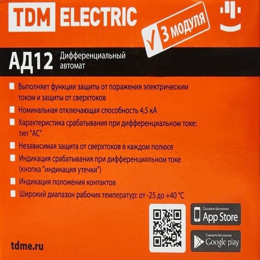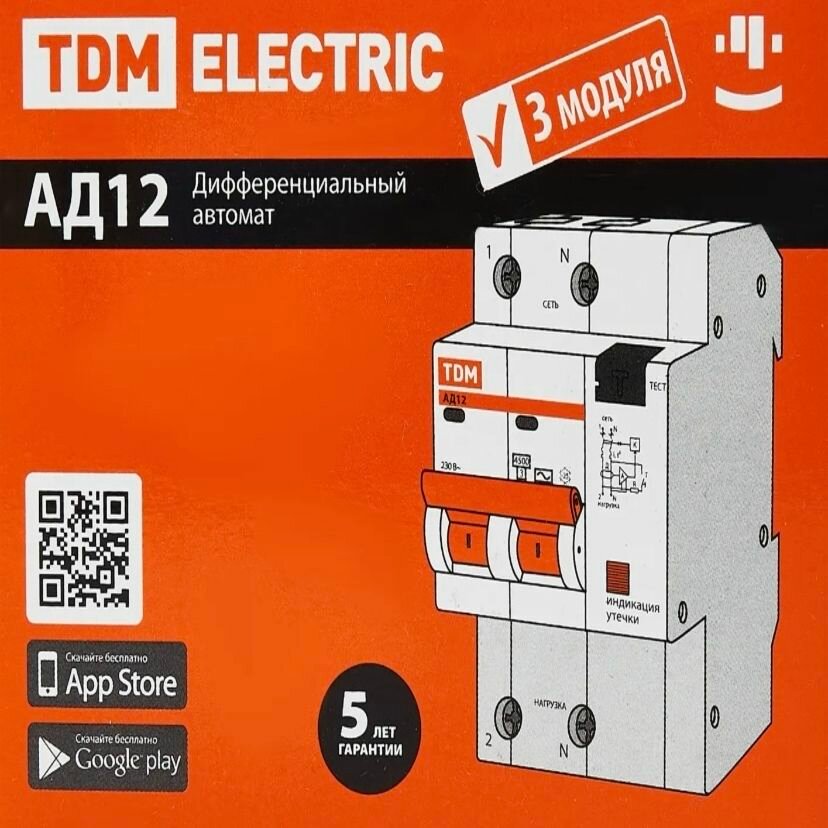**Дифференциальный автомат TDM Electric АД12** оснащен 2 портами (2P). Модель имеет компактный корпус, изготовлена из прочного, негорючего пластика. Монтируется на DIN-рейку.