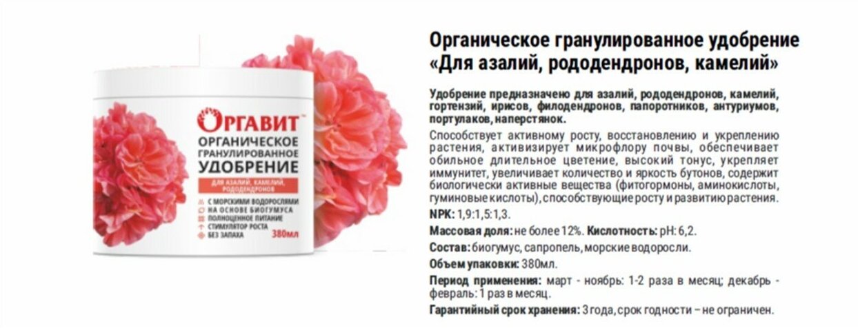 Удобрение предназначено для АЗАЛИЙ, РОДОДЕНДРОНОВ, КАМЕЛИЙ. Способствует активному росту, восстановлению и укреплению растения, активизирует микрофлору почвы