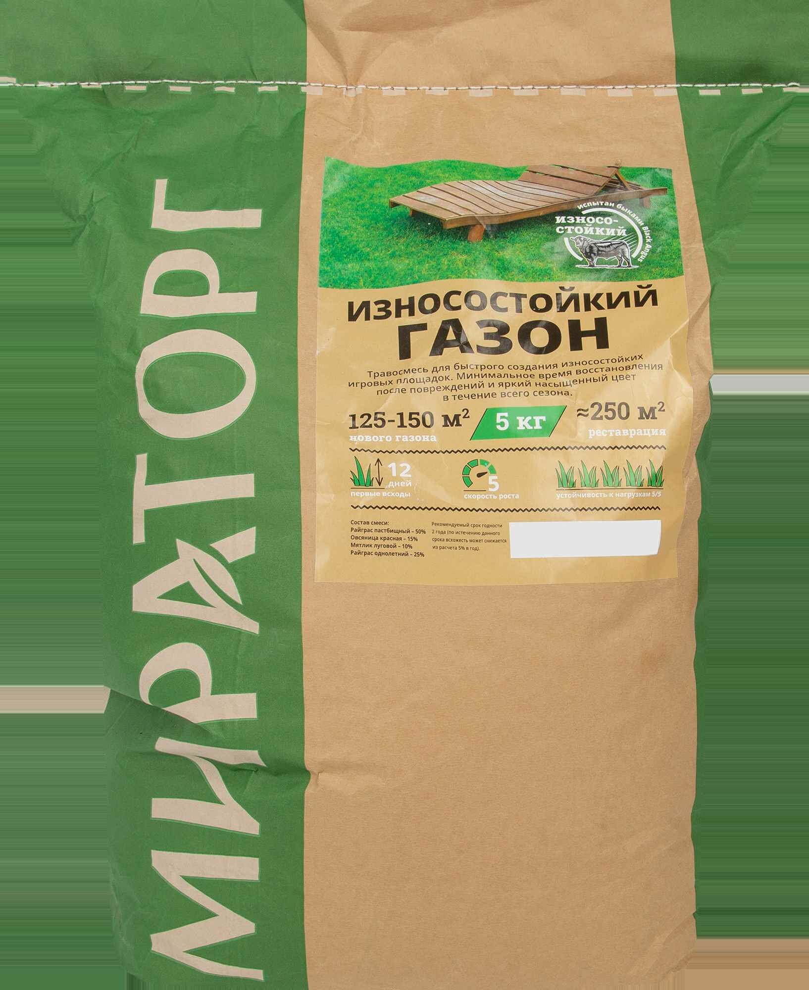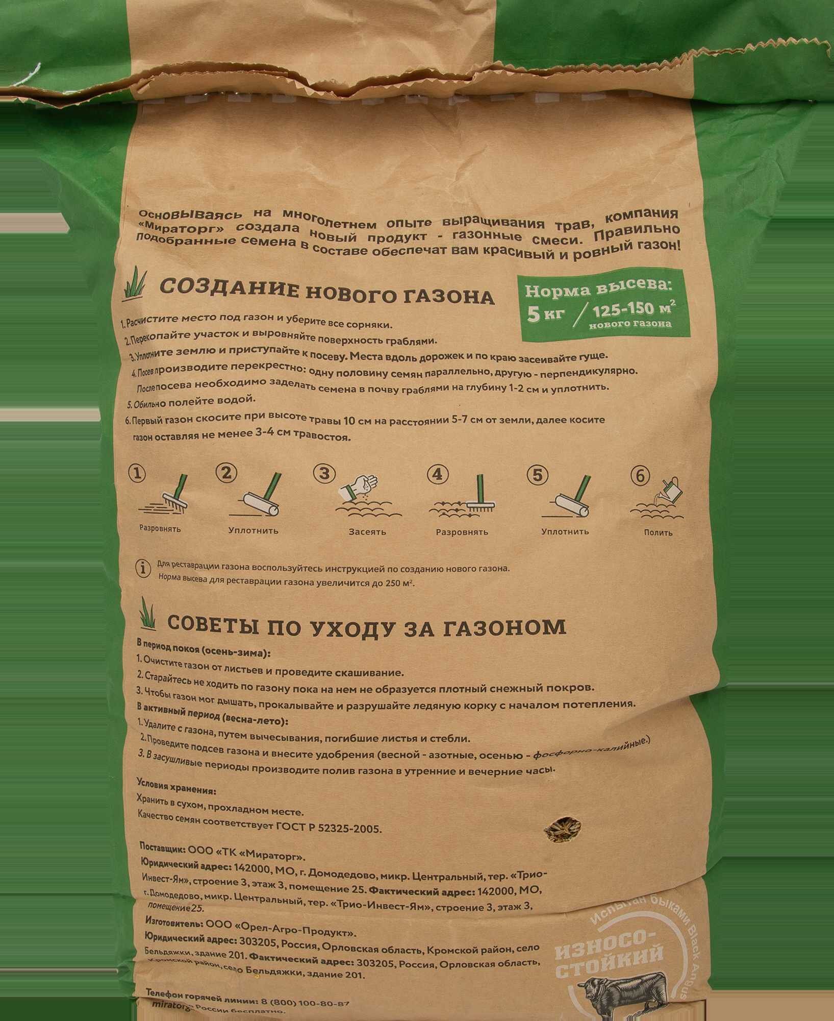 **Семена газона Мираторг износостойкий** предназначен быстрого озеленения игровых площадок. Первые всходы появляются уже на 12 сутки после посадки. Характеризуется устойчивостью к внешним воздействиям. Сохраняет насыщенность цвета в течение всего сезона. Одного пакета достаточно, чтобы засеять до 150 м² нового газона или обработки 250 м² в виде реставрации. Подробная инструкция по высеву и уходу размещена на обороте.