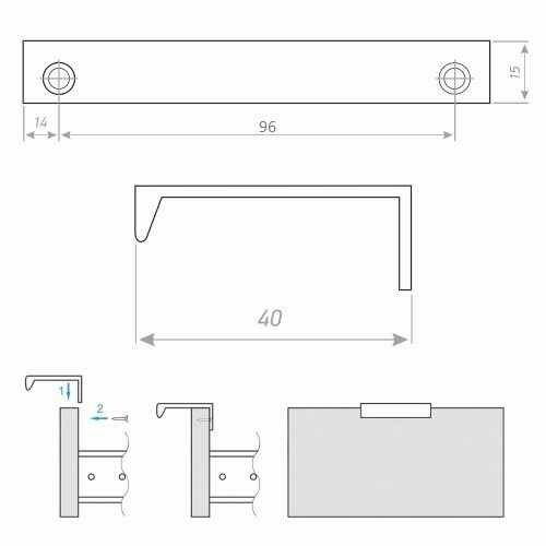 **Ручка-профиль CA1** — мебельная фурнитура, которая полностью прилегает к фасаду. Выполнена в виде небольшого отрезка металлического профиля, который фиксируется на торце или фасаде дверцы. Для изготовления использован алюминий — он придает ручке прочность и устойчивость к механическому воздействию. Монтаж осуществляется при помощи саморезов.