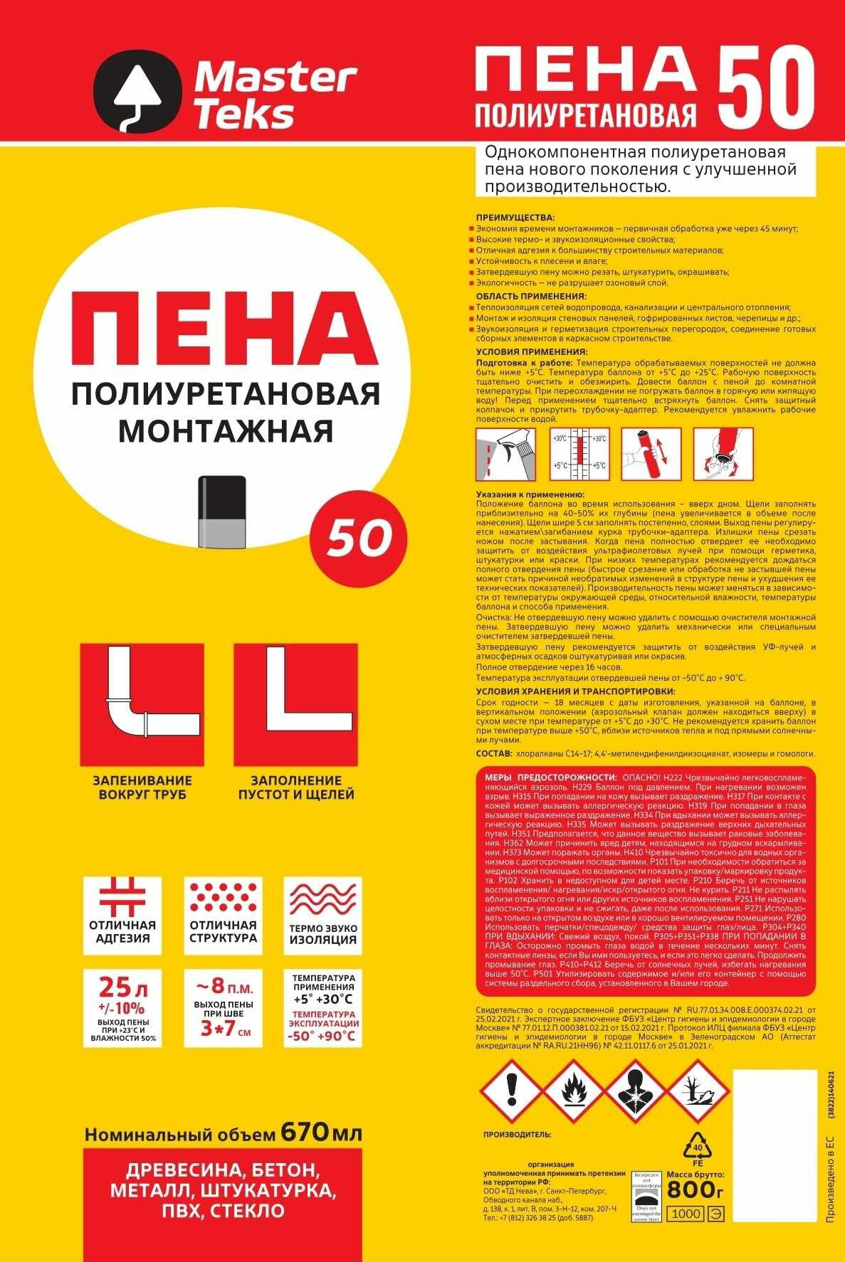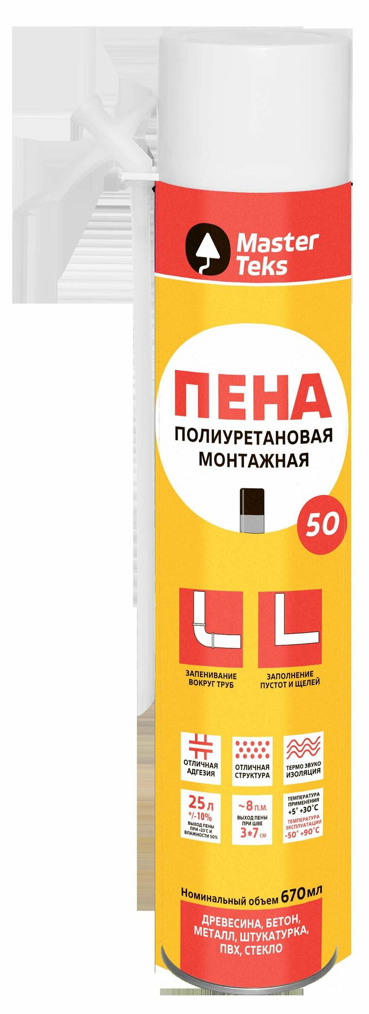 **Пена монтажная ручная Masterteks 50 летняя** — однокомпонентный полиуретановый состав, широко применяемый для герметизации и звукоизоляции перегородок, соединения сборных элементов в каркасном строительстве, монтажа и изоляции стеновых панелей, черепицы и других деталей. Эффективно заполняет пустоты и щели, а также запенивает пространство вокруг труб. Для более экономичного использования и точечного нанесения без специального пистолета баллон оснащен трубочкой. Небольшой диаметр способствует большему выходу состава и меньшему вторичному расширению.