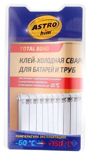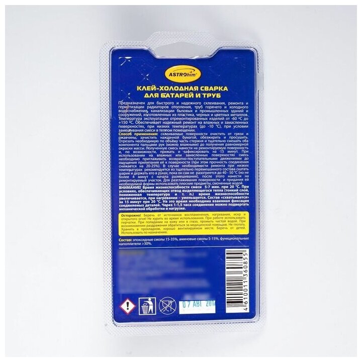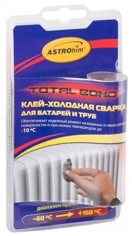 **Холодная сварка Astrohim** используется для оперативного ремонта батарей и труб. Обеспечивает надежную герметизацию восстановленного элемента. Перед использованием поверхности, которые нужно склеить между собой, нужно тщательно очистить от ржавчины и грязи, после чего зачистить, используя наждачную бумагу. Дополнительно поверхность рекомендуется обезжирить и просушить, прежде чем приступить к нанесению холодной сварки.