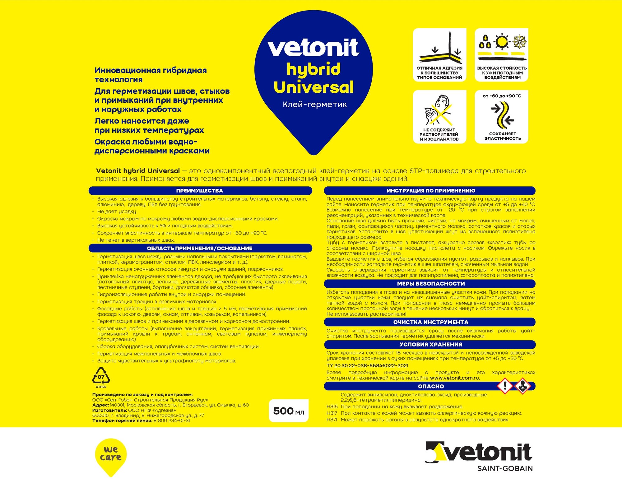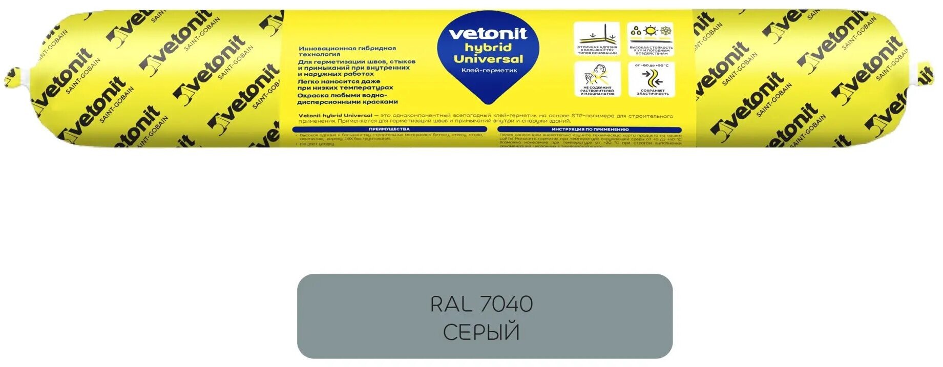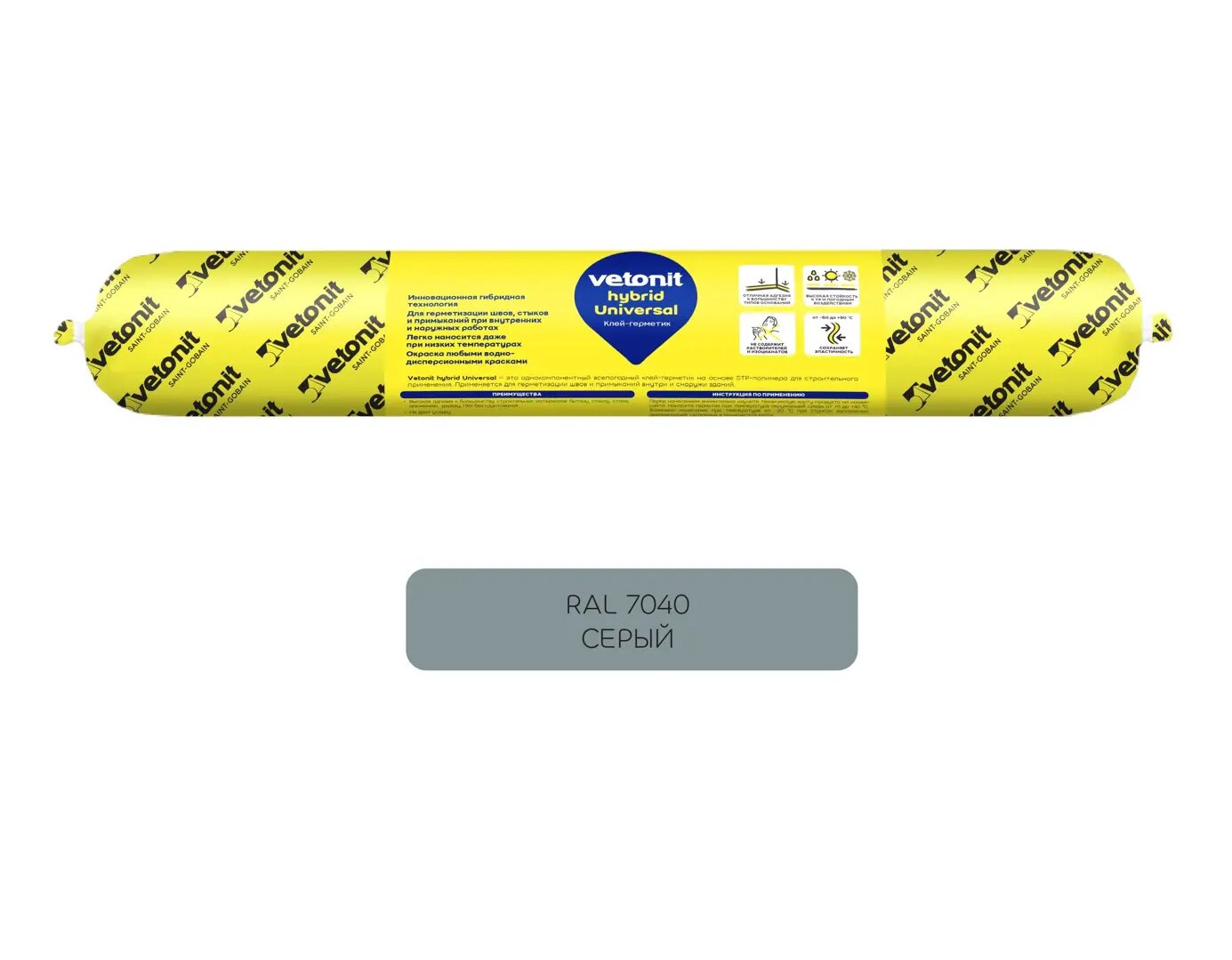 Vetonit Hybrid Universal - однокомпонентный клей-герметик на основе STP-полимера для строительного применения. Предназначен для герметизации швов между разными напольными покрытиями ( паркетом, ламинатом, керамогранитом, стеклом, пвх и пр.). Герметизации оконных откосов изнутри и снаружи зданий, подоконников. Приклейки ненагруженных элементов декора, не требующих быстрого склеивания (потолочный плинтус, лепнина, деревянные элементы, пластик, дверные пороги, лестничные ступени, бортики, досчатая обшивка, сборные элементы).Преимущества:- Высокая адгезия к большинству строительных материалов: бетону, стеклу, стали, алюминию, дереву, ПВХ, полиакрилатам, поликарбонатам без грунтования- Окрашивается мокрым по мокрому любыми водно-дисперсионными красками.- Высокая устойчивость к УФ и погодным воздействиям.- Не дает усадку- Не течет в вертикальных швах- Сохраняет эластичность в интервале температур от -60 до +90 °С- Высокая стойкость к воде, растворам щелочей, кислот, обычным растворителям Подходит для фасадных работы (заполнение швов и трещин >5 мм, герметизация примыканий фасада к цоколю, дверям окнам, отливам, козырькам, капельникам).Герметизации швов и примыканий в деревянном и каркасном домостроении.Кровельных работы (выполнение закруглений, герметизация прижимных планок, примыканий кровли к трубам, антеннам, световым куполам, инженерному оборудованию).Сборки оборудования, опалубочных систем, систем вентиляции. Герметизации межпанельных и межблочных швов, защита чувствительных к ультрафиолету материалов. Герметизации трещин в различных материалах.