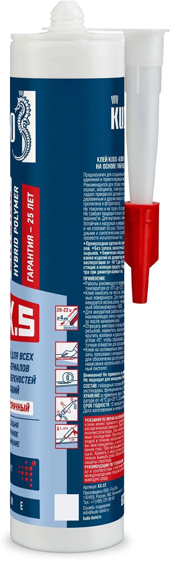 **Клей монтажный Kudo CR** предназначен для прочных клеевых соединений с повышенной подвижностью. Применяется при монтаже строительных и декоративных элементов на различные поверхности, исключая состоящих из полиэтилена, полипропилена и фторопласта.