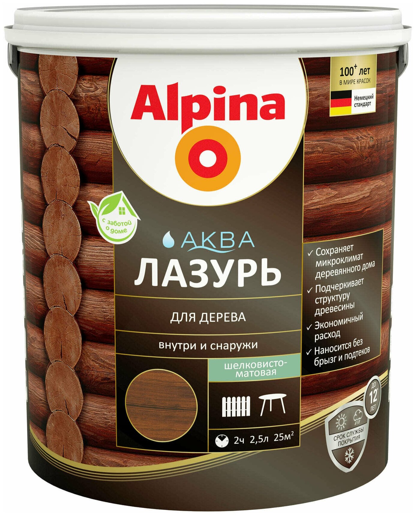 **Лазурь Alpina акриловая** представляет собой тонкослойную продукцию, предназначенную для нанесения на деревянные элементы, фасады. Помогает сохранить естественную текстуру материала. Формирует прочный слой, который надолго защищает древесину от атмосферного воздействия и способствует уменьшению поражения грибками. При этом лазурь сохраняет дышащие свойства древесины. Продукция произведена из таких компонентов, как вода, дисперсия акрилового сополимера, пигмент, целевые добавки. Перед применением с основания необходимо удалить смолу, пыль, старые непрочные покрытия и загрязнения. Также важно тщательно перемешивать средство - как перед использованием, так и в процессе работы. Для нанесения можно использовать кисть, валик или краскопульт. Выполнять работы при температуре не ниже +5°C.