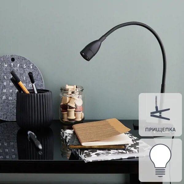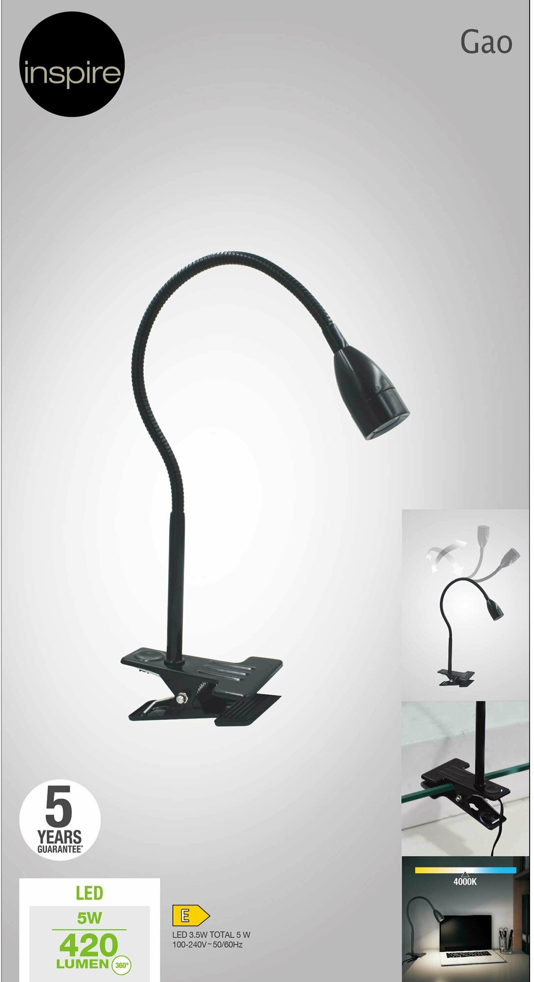 **Настольная лампа светодиодная Inspire Gao** идеально подходит для того, чтобы сопровождать вас во время работы или чтения. Полностью гибкая, может быть закреплена на поверхности, например, на столе, чтобы осветить область по вашему выбору. Выключатель на кабеле питания. Цвет лампы - черный.