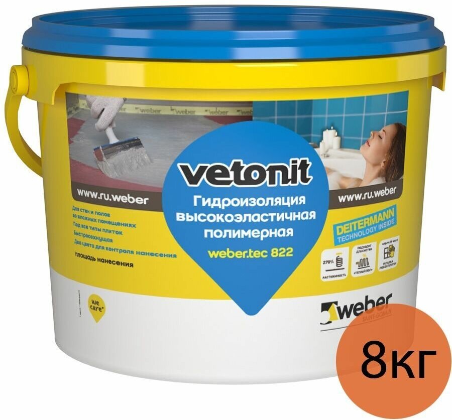 Готовая гидроизоляционная мастика Vetonit weber. tec 822 ведро, 1.2 кг, серая 1021458 - высокоэластичная бесшовная полимерная гидроизоляция под плитку для помещений с повышенной влажностью: ванных комнат, душевых, санузлов, кухонь, балконов и лоджий. Продукт служит для обработки оснований: бетонные и цементные полы, цементные и цементноизвестковые штукатурки, старые облицовочные плитки, ОСБ и ДСП, гипсокартонные листы, гипсоволокнистые листы, гипсовые штукатурки и полы.Технические характеристики:Высокая прочность сцепления с основанием: более 1,5 Мпа.Быстрое высыхание: 3 часа между нанесением слоев, 24 часа - перед монтажом плитки.Готовая к применению.Выдерживает раскрытие трещин благодаря растяжимости до 270 %.Подходит под любой формат плитки и керамогранита.Цветной состав для контроля нанесения слоев.Для обогреваемых полов и стен.