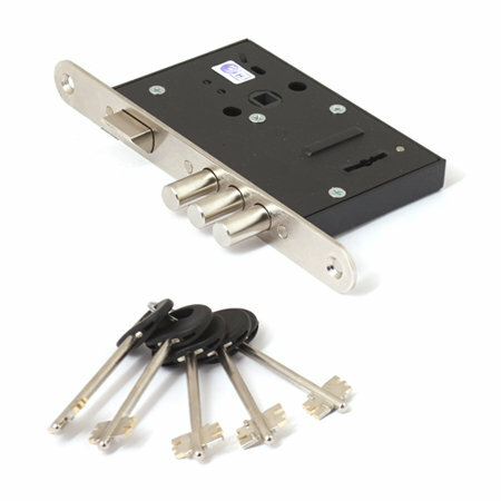 Замок врезной сувальдный. Замок имеет одно направление запирания. Ригели из никелированной стали. Запирание происходит на 2 полуоборота. Модель снабжена защелкой, что позволяет использовать этот замок в качестве основного запирающего устройства. Может быть установлен в стальные и деревянные двери.