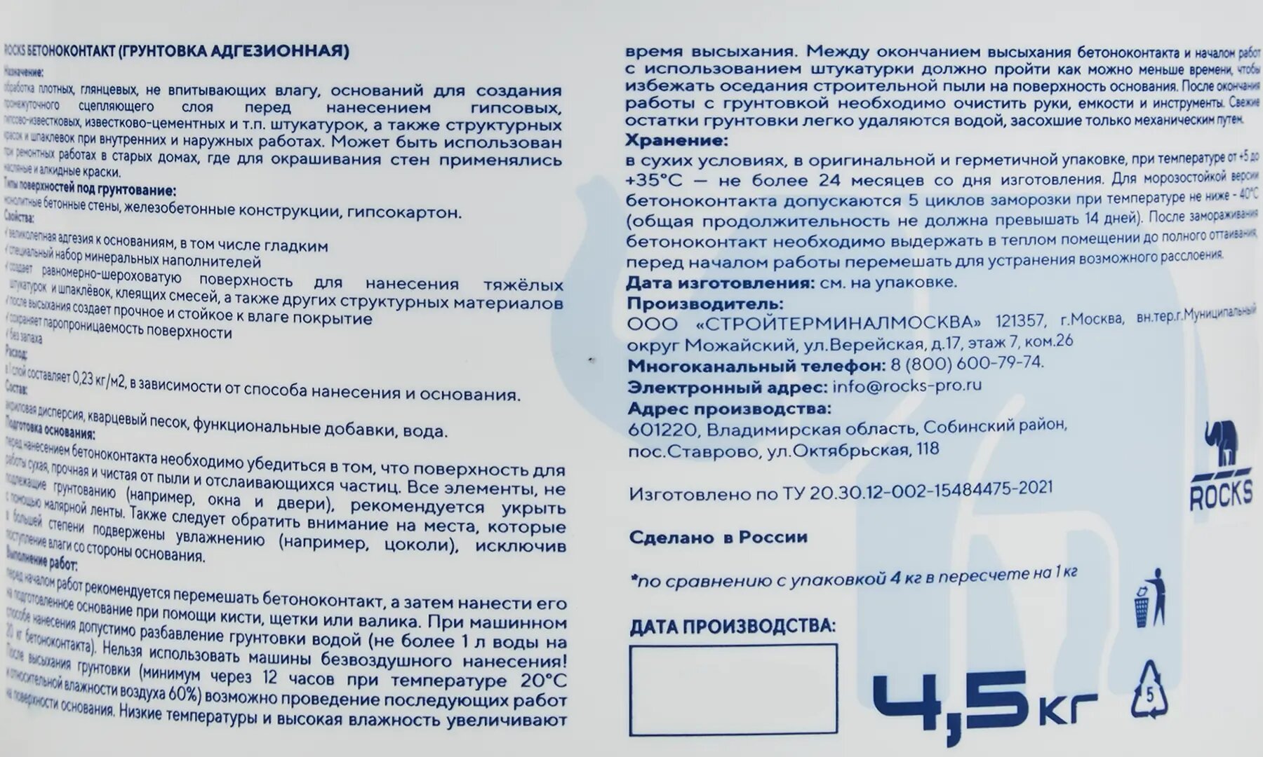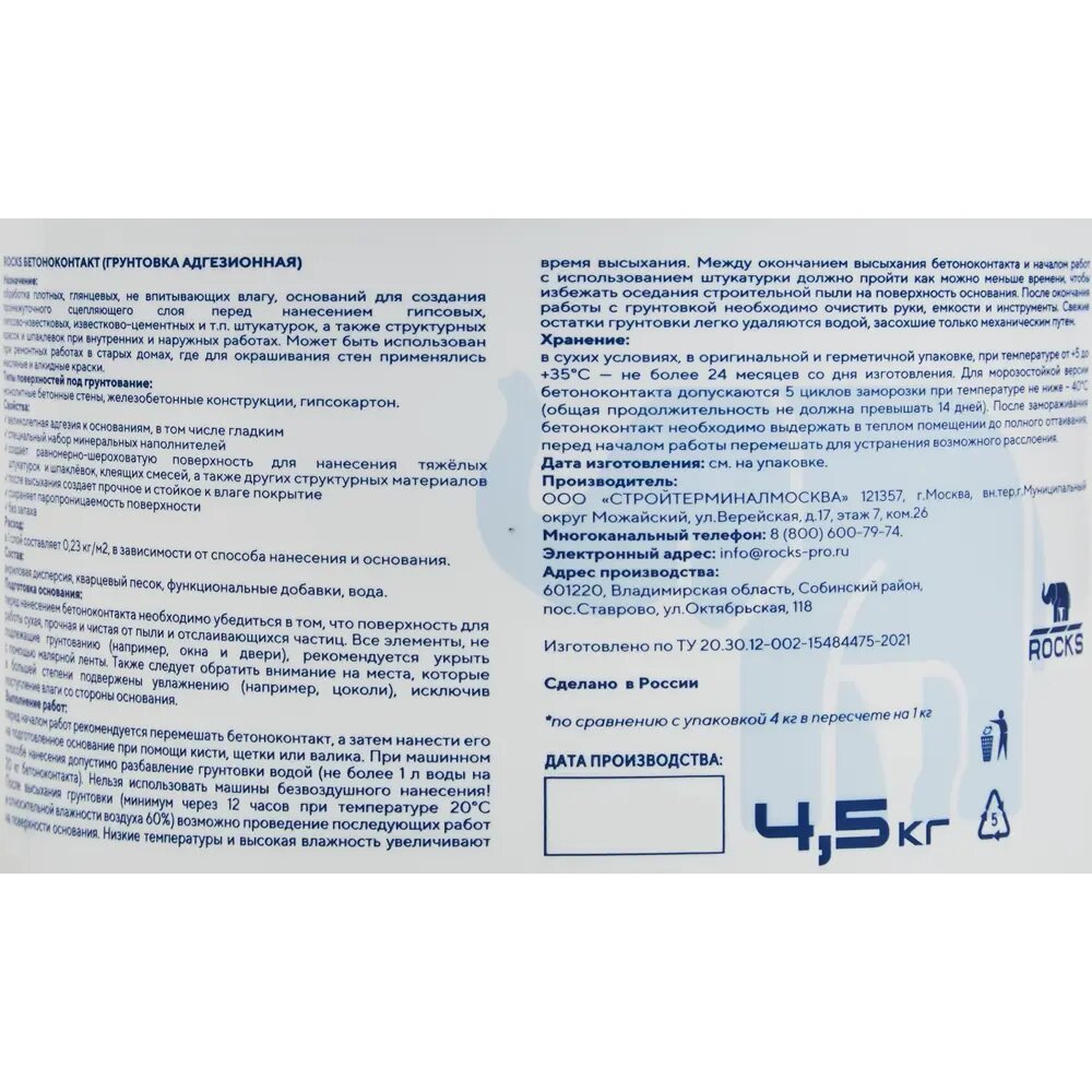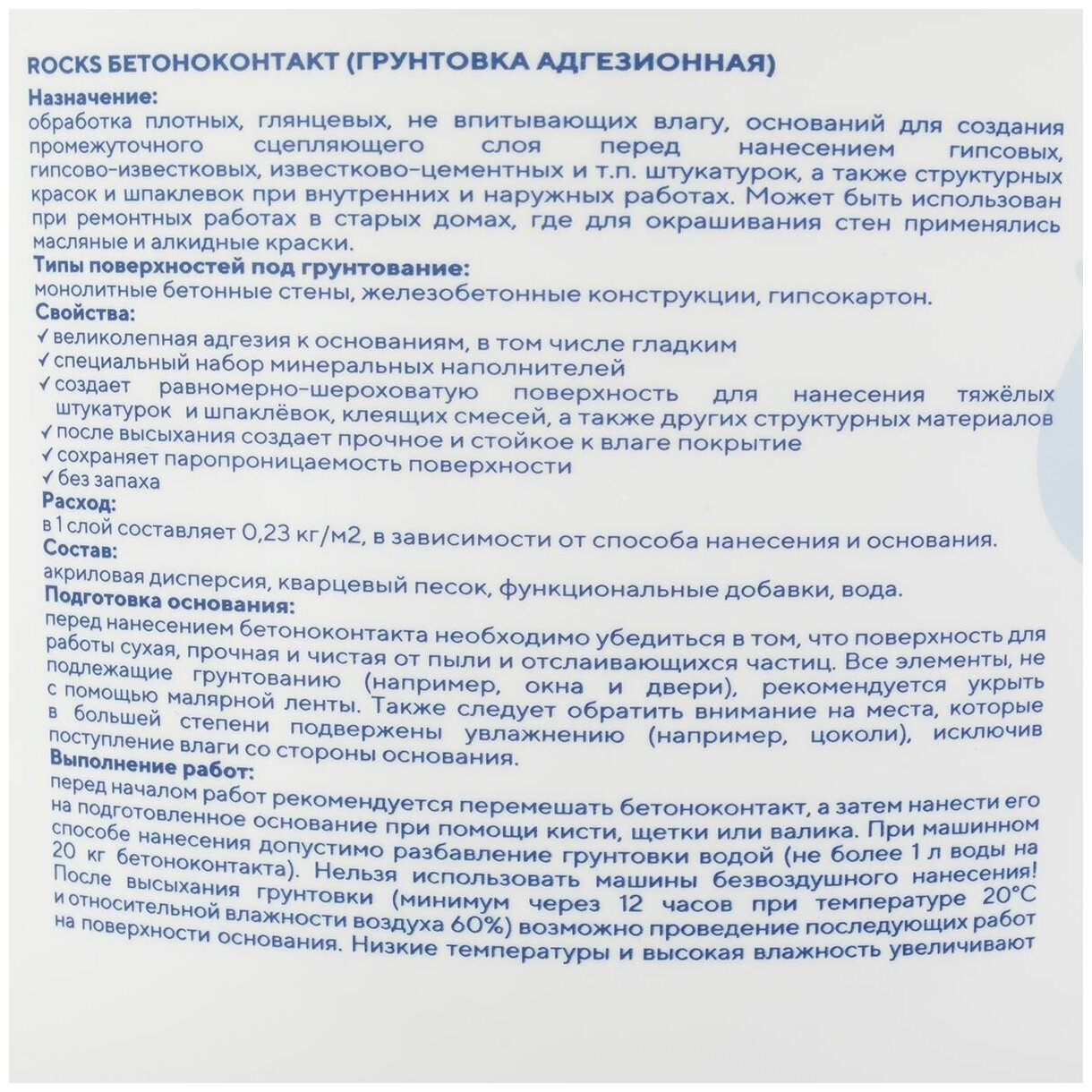 ROCKS-Бетоноконтакт – грунтовка готовая, к применению, не содержащая растворителей полимерная дисперсия голубого цвета с добавлением кварцевого песка. Предназначена для обработки плотных, гладких, слабовпитывающих и не впитывающих влагу оснований, например бетона, цементных штукатурок, пенополистирольных и пазогребеневых плит, ЦСП под гипсовые штукатурки и шпаклевки.
