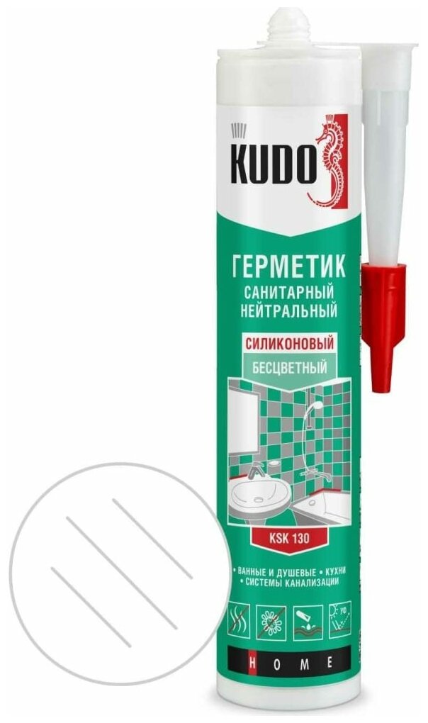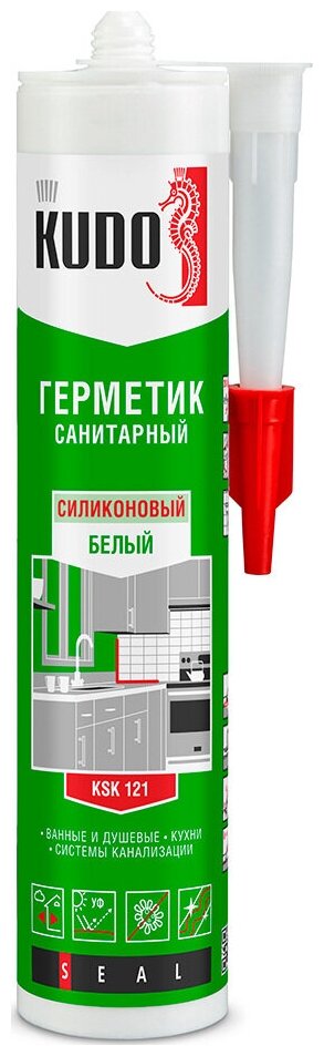 **Герметик силиконовый Kudo** используется для уплотнения стыков между поверхностями из бетона, металла, керамики, стекла, дерева, мрамора, камня. Быстро схватывается. Минимальная температура герметика при укладке — 20°C, максимальная — 25°C. Возможно использование для герметизации стыков в душевых кабинах, бассейнах и на теплых полах. Легко смывается с инструментов теплой водой. Поверхность перед работами требуется очистить от мусора, пыли и обезжирить.