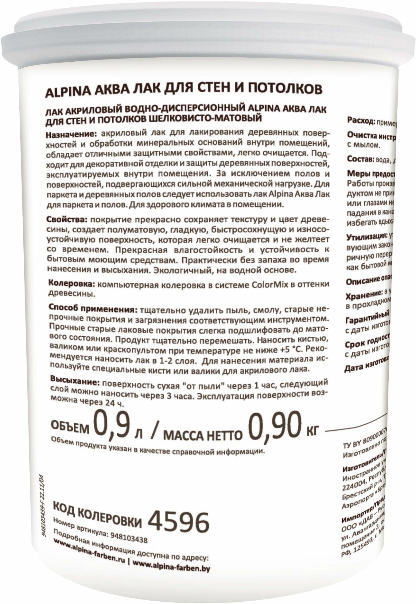 Область применения: Акриловый лак для деревянных поверхностей, обладает отличными защитными свойствами, легко очищается. Подходит для декоративной отделки и защиты деревянных поверхностей, а также для обработки минеральных поверхностей, эксплуатируемых внутри помещения. Свойства: сохраняет текстуру древесины; легко очищается; без запаха; придает устойчивый блеск; Расход: 0.1 л/м2