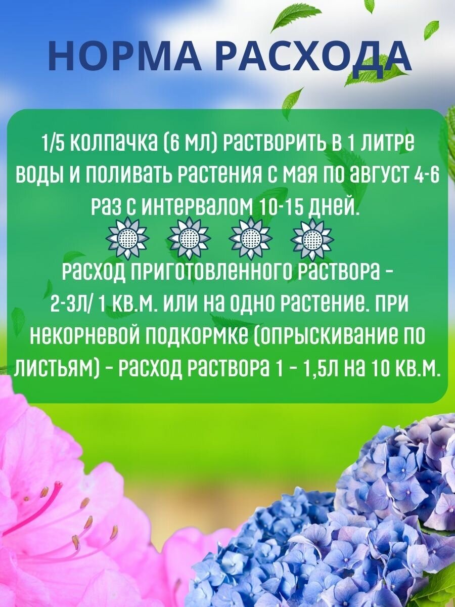 | Особенности | Для питания, здорового роста и развития гортензий,азалий, рододендронов,вересковых культур. Повышает интенсивность окраски цветов и листьев растений, увеличивает продолжительность цветения. |