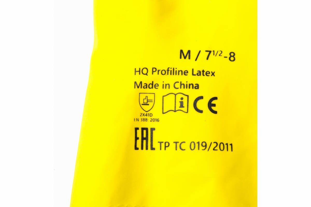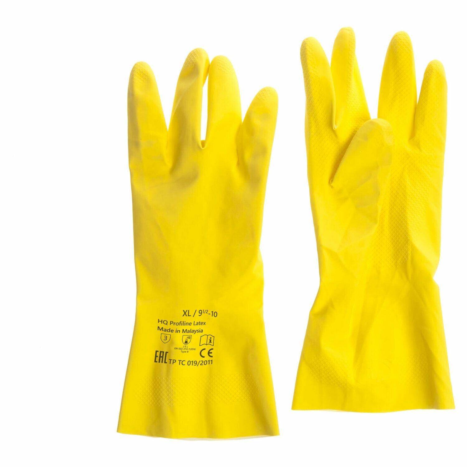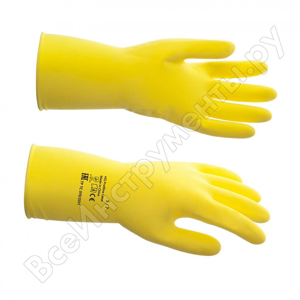 **Перчатки латексные Profiline HQ** с хлопковым внутренним напылением. Размер — 10/XL. Изделия устойчивы к химическим средствам, обеспечивают надежный хват. В наборе поставляются две перчатки. На упаковке размещена инструкция по определению размера руки.