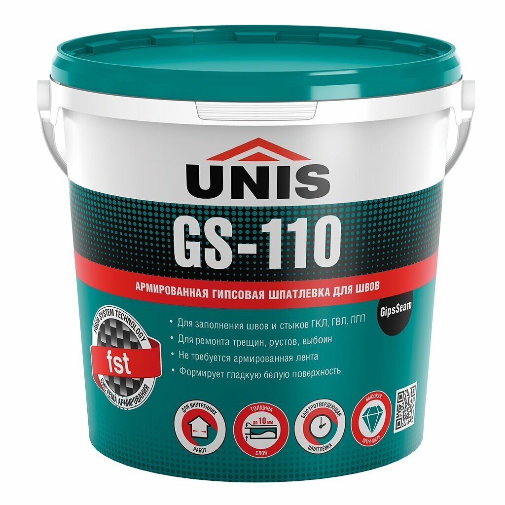 **Шпаклёвка гипсовая Unis GipsSeam GS-110** используется для заделки швов. Характеризуется высокой прочностью. Формирует ровную и гладкую поверхность, которая может подвергаться дальнейшей обработке — покраске, поклейке обоев, нанесению декоративной штукатурки.
