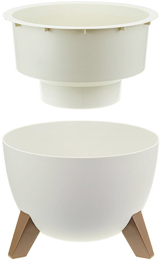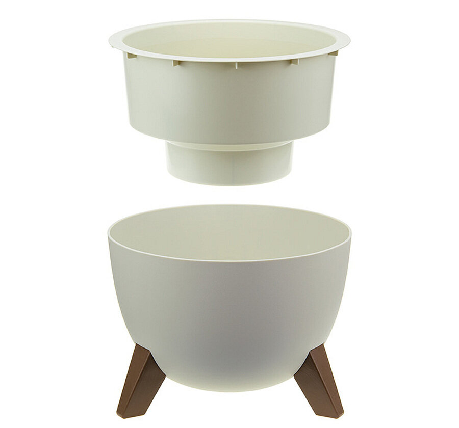 Кашпо со вставкой на ножках имеет круглую форму и матовую поверхность.