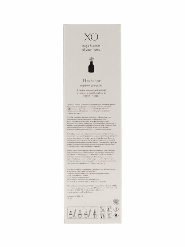 **Ароматический диффузор Arida Home Xo The Glow** в стеклянной банке предназначен для создания комфортной атмосферы в помещениях любого назначения. Основа изделия – натуральный растительный воск с добавлением масла ши. Растопленный, его можно наносить на кожу рук и тела для ароматизации и увлажнения.