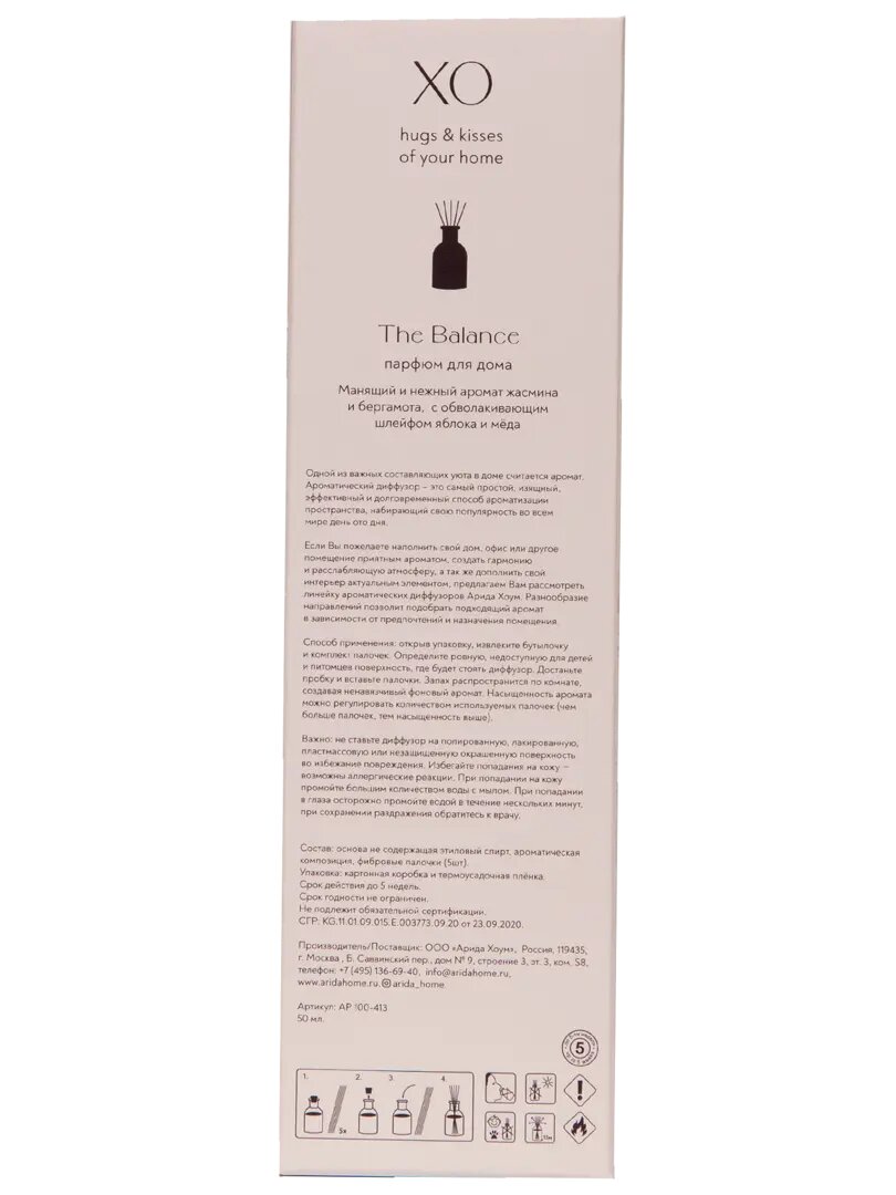 **Ароматический диффузор Arida Home Xo The Balance** в стеклянной банке предназначен для создания комфортной атмосферы в помещениях любого назначения. Основа изделия – натуральный растительный воск с добавлением масла ши. Растопленный, его можно наносить на кожу рук и тела для ароматизации и увлажнения.