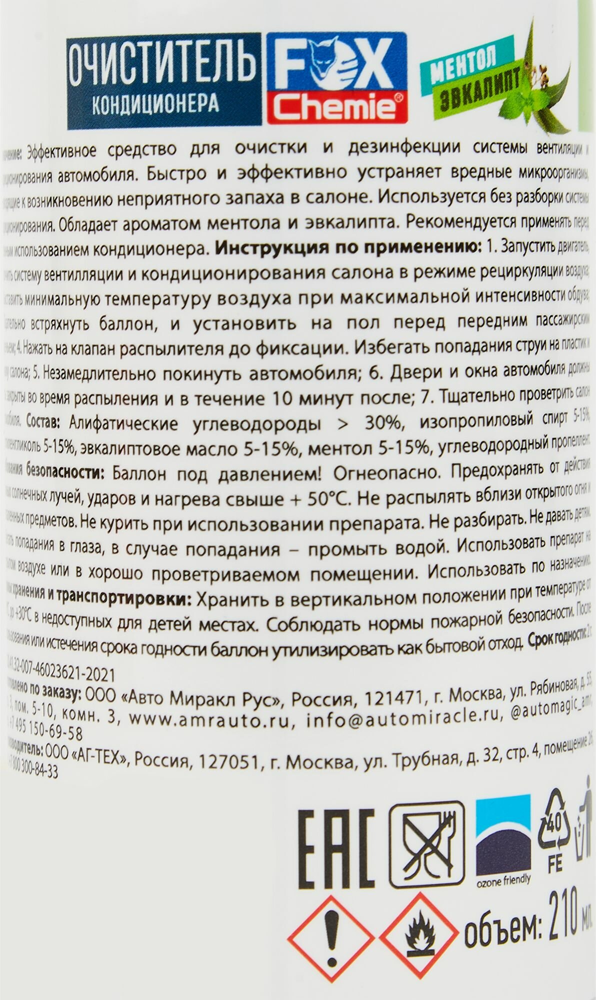 **Очиститель кондиционера Fox Chemie 210 мл** предназначен для очистки и дезинфекции системы вентиляции и кондиционирования автомобиля. Быстро и эффективно устраняет вредные микроорганизмы, приводящие к возникновению неприятного запаха в салоне.