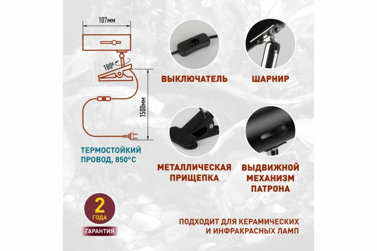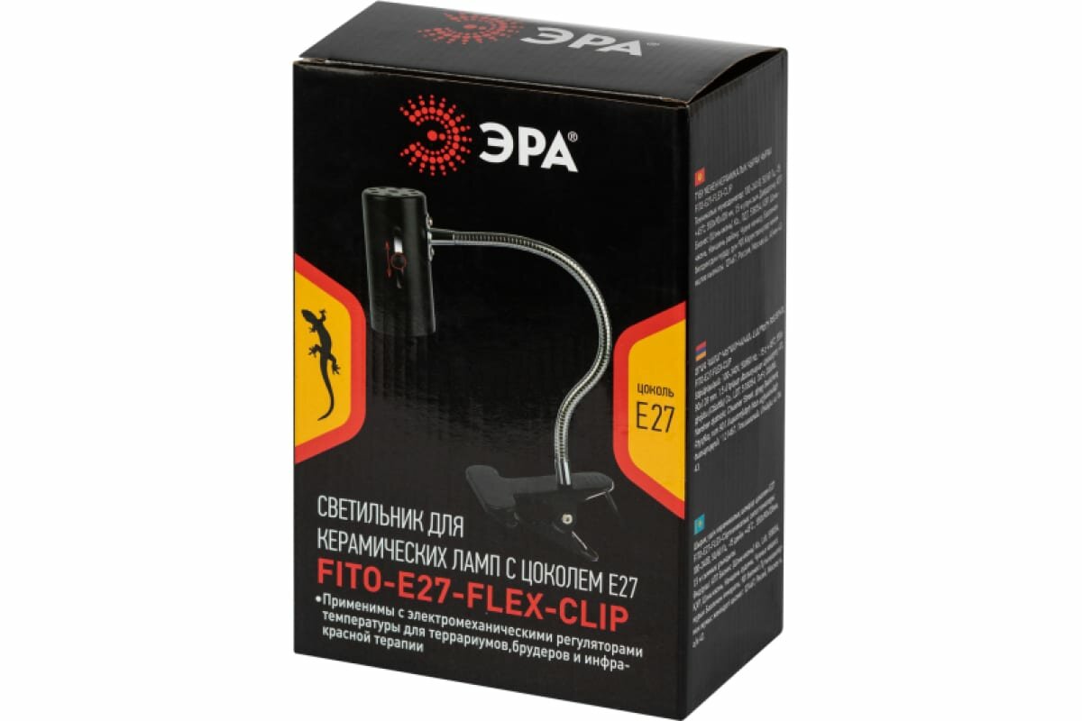 Светильник для рептилий ЭРА FITO-E27-FLEX-CLIP 250 Вт - это уникальное решение для создания комфортных условий обитания для ваших питомцев.Светильник выполнен в стильном черном цвете, который эстетично впишется в интерьер любого дома.Конструкция светильника продумана до мелочей. Гибкая стойка позволяет регулировать направление света, а поворотный плафон на шарнире обеспечивает удобство использования. Выдвижной механизм патрона позволяет легко менять лампы, а термостойкий провод длиной 1,5 метра обеспечивает безопасность использования.Светильник подходит для керамических и инфракрасных ламп мощностью до 250 Вт. Это позволяет использовать его с различными типами ламп, обеспечивая оптимальный спектр света для ваших питомцев.Светильник имеет степень пылевлагозащиты IP20, что гарантирует его безопасность и долговечность.Светильник для рептилий ЭРА FITO-E27-FLEX-CLIP 250 Вт - это не только стильный и функциональный аксессуар для вашего террариума, но и забота о комфорте и здоровье ваших питомцев.