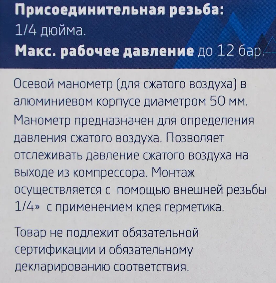 На сегодняшний день товар «Манометр для компрессора Pegas Pneumatic 4802 12 бар 1/4 дюйма» можно купить с кешбеком в 1 магазине: Яндекс.Маркет