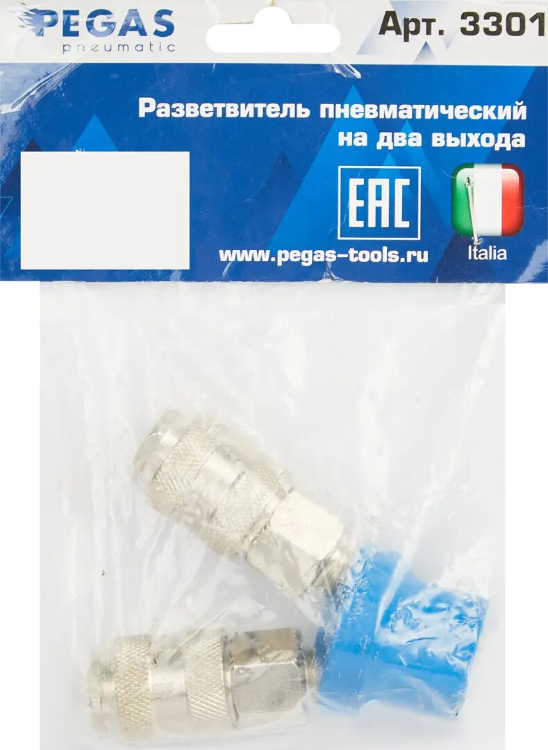 **Разветвитель пневматический Pegas Pneumatic** оснащен двумя выходами и позволяет одновременно подключить два инструмента. Подходит для эксплуатации в мастерских, автосервисах, при строительных и монтажных работах.