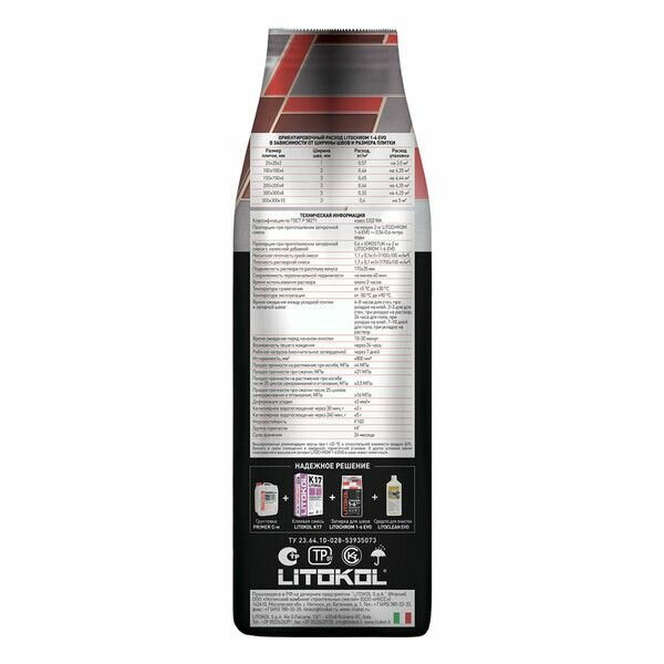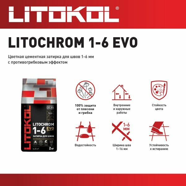 LITOCHROM 1-6 EVO — цветная цементная затирка для заполнения межплиточных швов шириной 1-6 мм с противогрибковыми свойствами. Предназначена для затирки швов при облицовке стен и полов керамической плиткой, стеклянной мозаикой, керамогранитом, натуральным камнем, агломератом. LITOCHROM 1-6 EVO — цементная (С) затирочная смесь для межплиточных швов (G) с улучшенными техническими характеристиками (2) с пониженным водопоглощением (W) и с повышенной стойкостью к истиранию (A), относится к классу CG2 WA согласно классификации ГОСТ Р 58271. Преимущества:• Увеличенная эксплуатационная стойкость к механическому воздействию, деформационным и истирающим нагрузкам (интенсивные пешеходные нагрузки, перемещение мебели);• устойчивость к образованию плесени и грибка;• низкое водопоглощение шва;• устойчивость к перепадам температур;• минимизированная усадка;• стойкость цвета. Затирка предназначена для межплиточных швов шириной 1-6 мм внутри и снаружи помещений, при облицовке стен и полов:• жилых помещений (гостиные, кухни, санузлы и т.п.);• общественных помещений (входные группы, МОП, медицинские, образовательные учреждения, подсобные помещения, супермаркеты, торговые центры, склады),• облицовка фасадов, бетонных лестниц, балконов, террас*,• цементные стяжки с водяным и электрическим подогревом*. *- На основаниях подверженных интенсивному механическому воздействию, на «тёплых» полах, на основания с высокой водной нагрузкой таких как влажные помещения, бассейны, чаши бассейнов, на балконах, террасах и т.д., рекомендуется затворять (смешивать) с латексной добавкой IDROSTUK-м без добавления воды (пропорции приготовления смеси указаны в технической информации). При этом улучшается эластичность затирочной смеси, увеличивается адгезия затирки к торцам плитки, уменьшается водопоглощение затирки в швах. Перед применением необходимо ознакомиться с инструкцией.