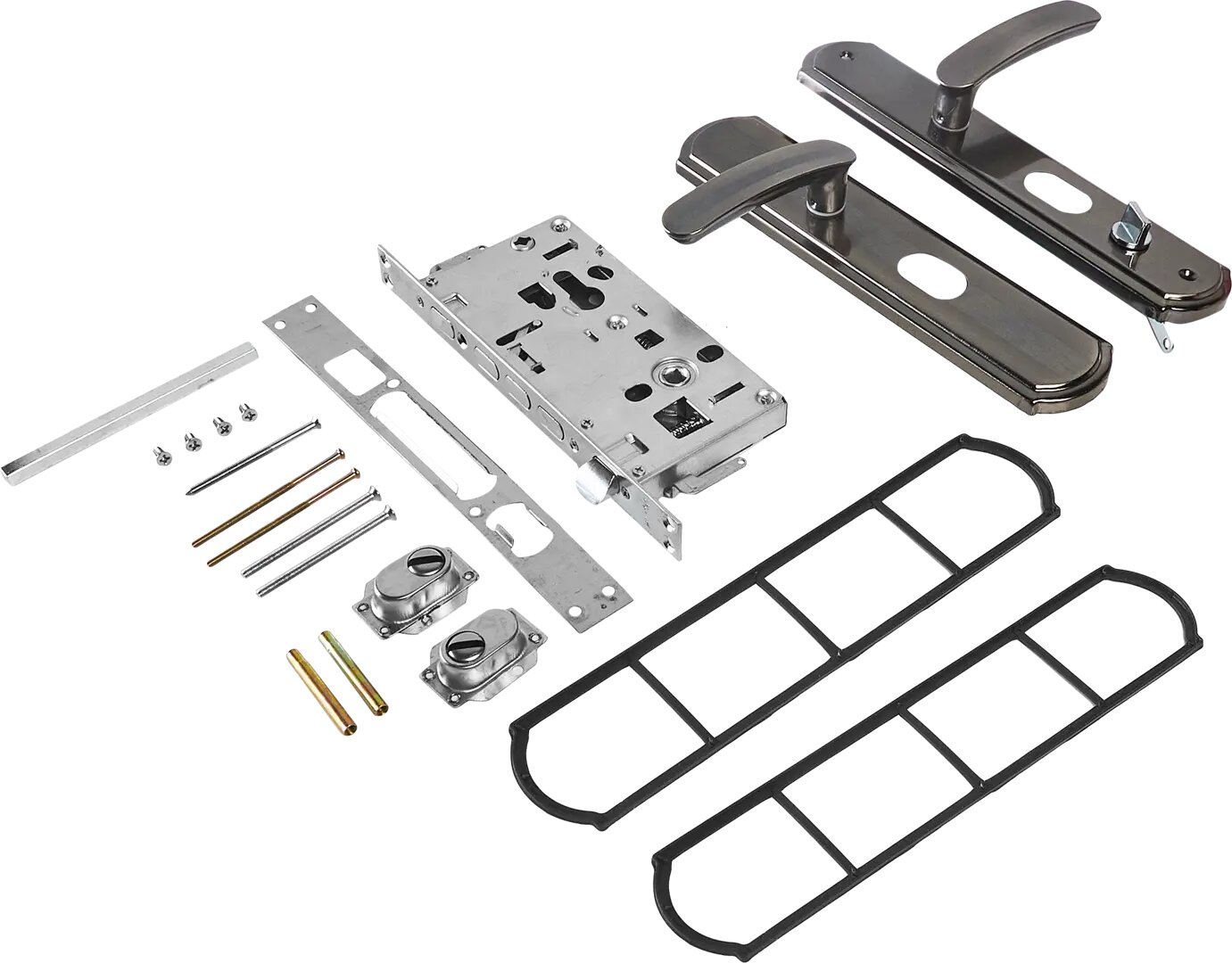 Модификация под цилиндровый механизм и фиксатор. Межосевое расстояние – 68 мм. Материал производства ручек – алюминий, планки изготовлены из стали. Многослойное гальваническое покрытие обеспечивает поверхности изделия дополнительную устойчивость к коррозии и механическим повреждениям. В комплект поставки входит комплект из двух ручек на планках, накладки под цилиндр, соединительный квадрат, крепёж