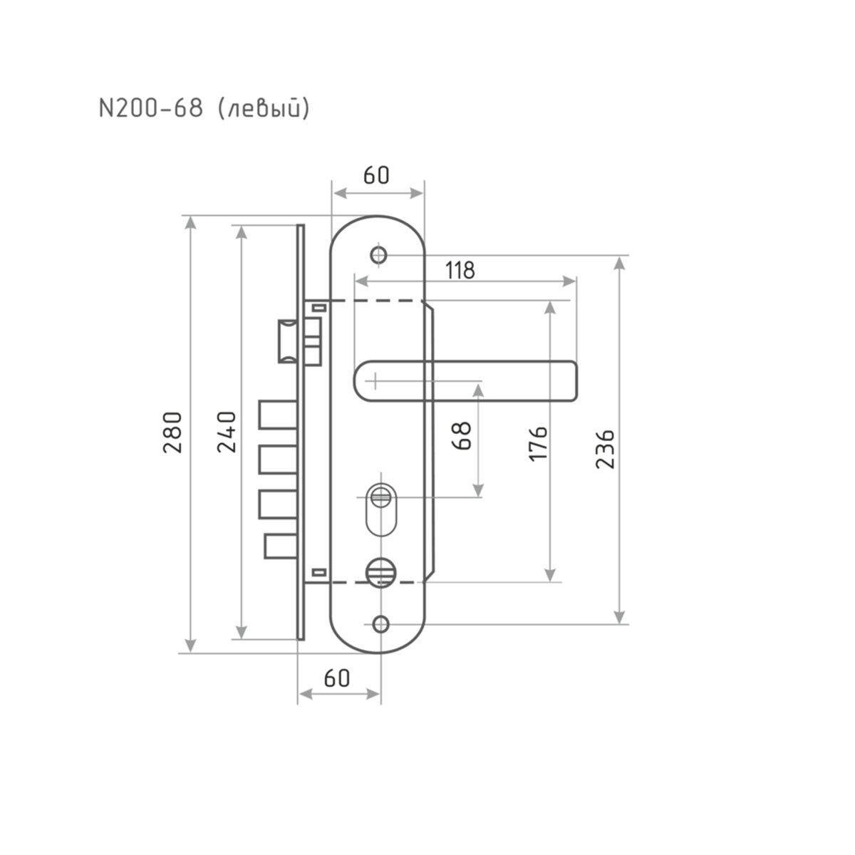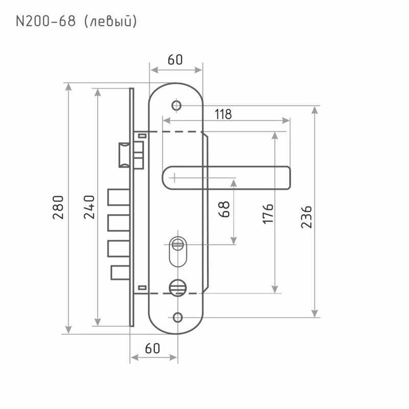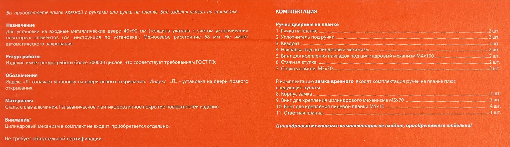 Межосевое расстояние составляет 68 мм, бэксет – 60 мм. Дверные ручки литые, изготовлены из алюминия. Планки и корпус замка производятся из стали. Замок оснащён тремя ригелями овального сечения из закалённой стали. Данный комплект замка для дверей левого открывания.