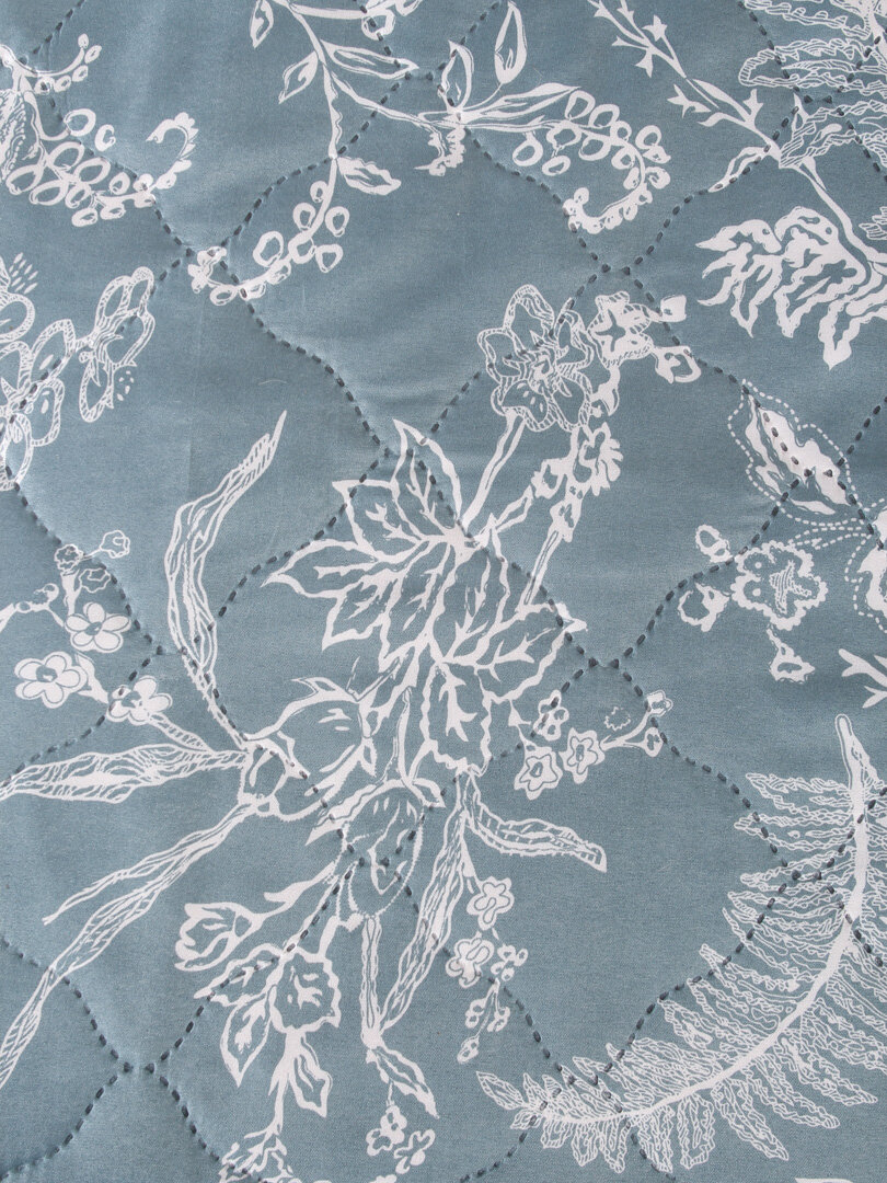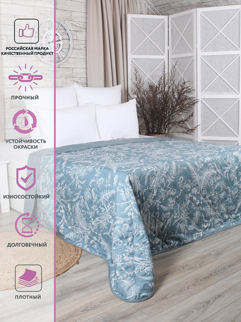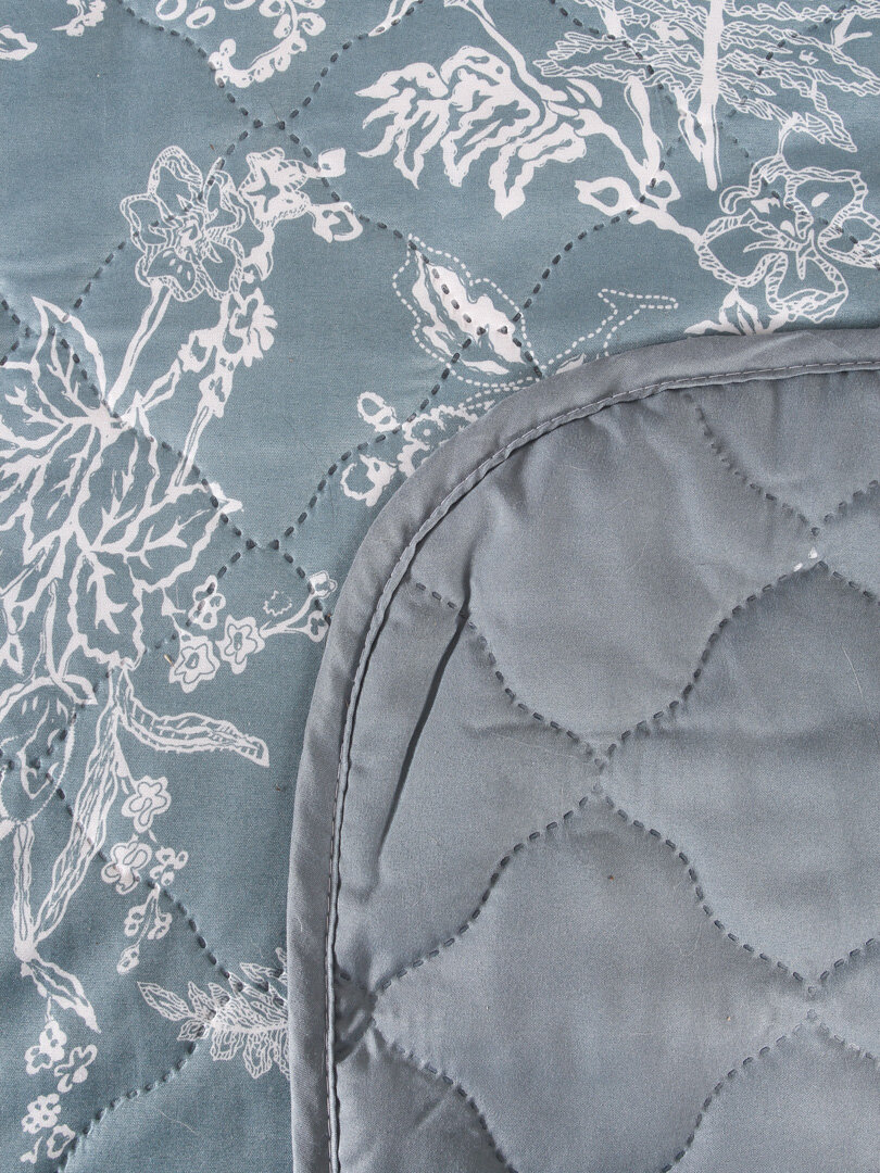 Покрывала стеганое двух стороннее. Одна сторона покрывала с рисунком. Другая сторона из однотонной ткани. Размер 200*220. Края окантованы косой бейкой. Ткань микрошелк. Состав ткани 100% ПЭ. Наполнитель синтепон плотностью 100 гр/м2. Состав наполнителя 100% ПЭ. Покрывало перевязано атласной лентой. Упаковка пакет.