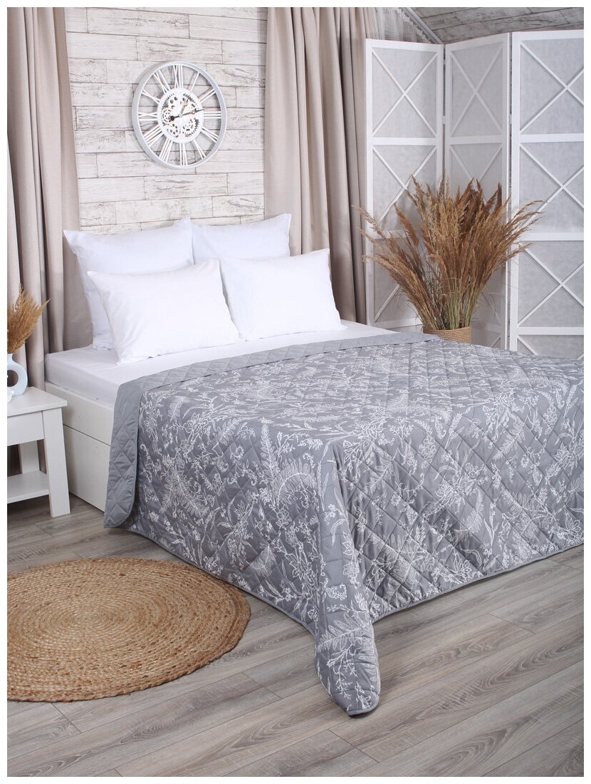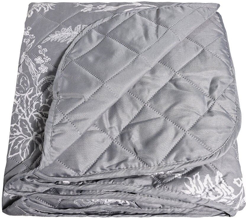 Покрывала стеганое двух стороннее. Одна сторона покрывала с рисунком. Другая сторона из однотонной ткани. Размер 200*220. Края окантованы косой бейкой. Ткань микрошелк. Состав ткани 100% ПЭ. Наполнитель синтепон плотностью 100 гр/м2. Состав наполнителя 100% ПЭ. Покрывало перевязано атласной лентой. Упаковка пакет.