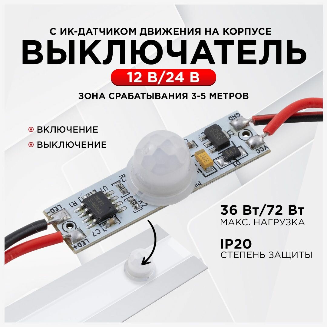 Выключатель с ИК датчиком движения на корпусе 04-46 предназначен для управления светодиодной монохромной лентой 12/24 В. Выключатель устанавливается в алюминиевый профиль, в экране которого необходимо сделать отверстие размером 7х5 мм для работы датчика. При улавливании движения происходит включение и выключение света. При пропадании движения свет отключается через 30 секунд. Зона срабатывания 3-5 м. Одно из преимуществ данного изделия заключается в возможности работать как от напряжения 12 В, так и 24 В, а значит его можно использовать со светодиодными лентами с соответствующим напряжением. Важно отметить, что в зависимости от того, с каким напряжением предстоит работать устройству, будет отличаться и максимальная мощность нагрузки, которую можно подключить к нему. Так, при напряжении 12 В максимальная нагрузка будет равна 36 Вт, а при напряжении 24 В уже 72 Вт. Это значит, что данному изделию вы можете к подключить в два раза больше светодиодной ленты 24 В. Встраиваемый выключатель имеет размеры 38х10х6,2 мм. Степень защиты от пыли и влаги соответствует стандарту IP20, что подразумевает установку устройства в сухом, проветриваемом помещении.Преимущества:- Имеет малые габариты, благодаря чему выключатели подходят для установки в алюминиевый профиль;- Позволяет управлять монохромной светодиодной лентой бесконтактно;- Подходят для управления лентой 12В и 24В;- Простой монтаж.