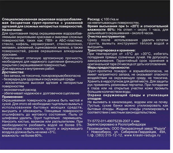 **Грунт-пропитка Радуга Ultra Fix** предназначена для сухих и влажных помещений. Используется для обработки оснований перед окрашиванием акриловыми красками, эмалями. В том числе наносится и на сложные поверхности, к примеру, на ПВХ или АБС-пластик, стекло, керамику, стекловолокно, оцинкованное железо. Также может применяться для обработки оснований, ранее окрашенных алкидными красками.
