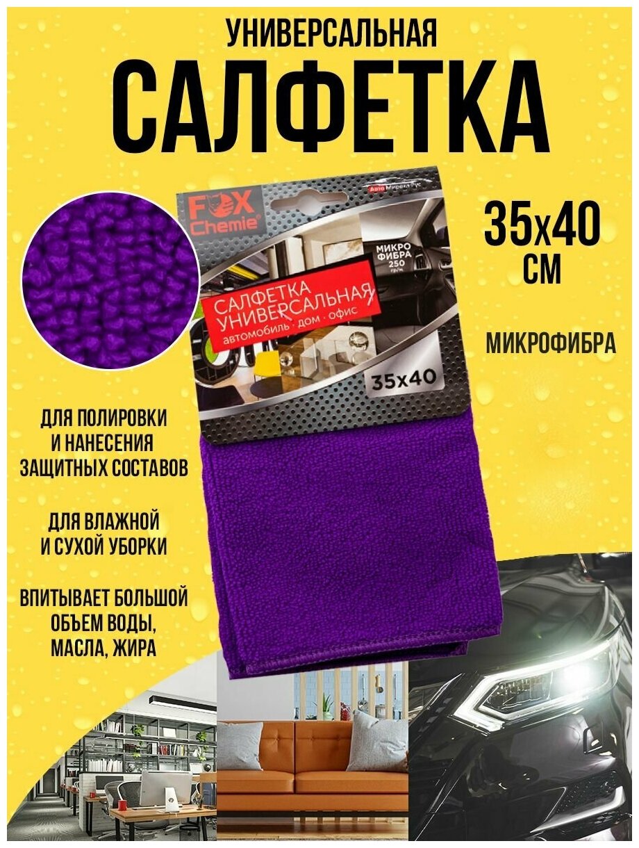 **Салфетка универсальная 35х40 см Fox Chemie** для автомобиля, дома, офиса. Применяется для полировки и нанесения защитных составов, влажной и сухой уборки. Справляется с грязью, пылью и другими различными загрязнениями.