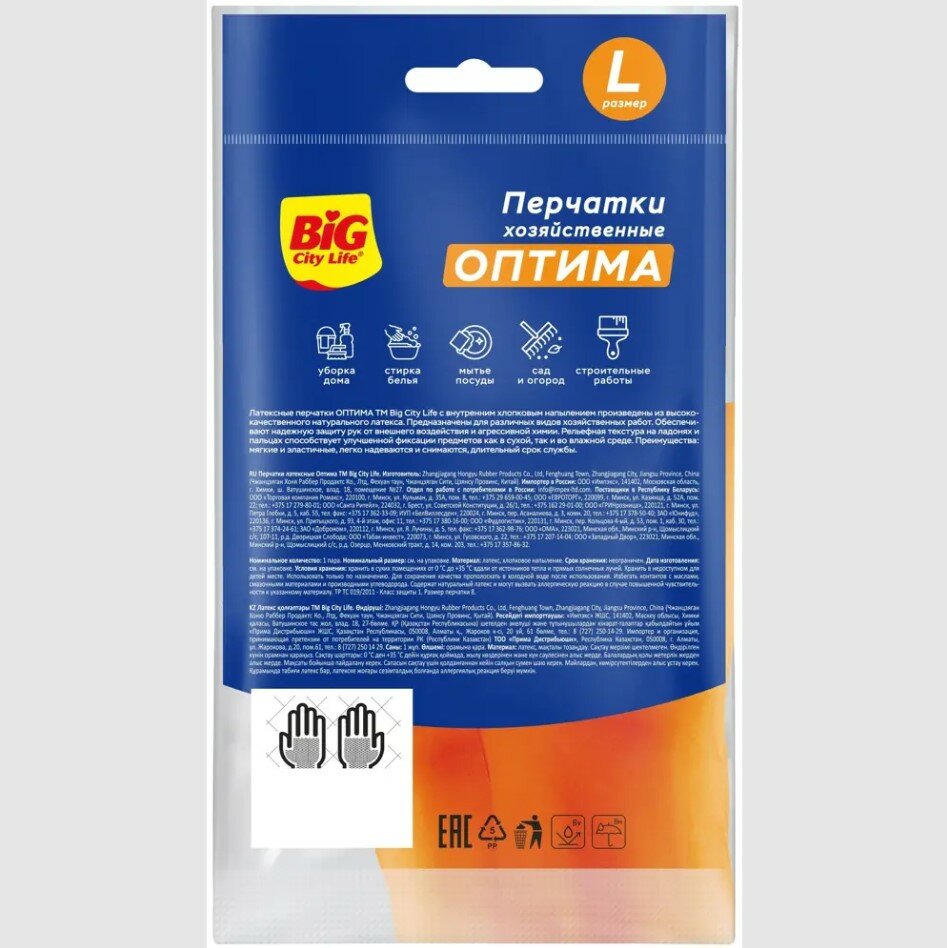 BIG CITY Перчатки латексные "Оптима" размер L - незаменимые помощники для хозяйки в процессе уборки и стирки. Перчатки изготовлены из натурального высококачественного латекса. Хлопковое напыление внутри надежно защищает руки от раздражения. Внешняя рельефная сторона в области пальцев и ладошки обеспечивает уверенный захват и фиксацию скользких предметов. Перчатки легко одеваются и снимаются, не скатываются. Яркий привлекательный дизайн и оранжевый цвет перчаток создают хорошее настроение и помогают достичь отличного результата. Размер S подходит для женских рук, размерная сетка есть на оборотной стороне упаковки.