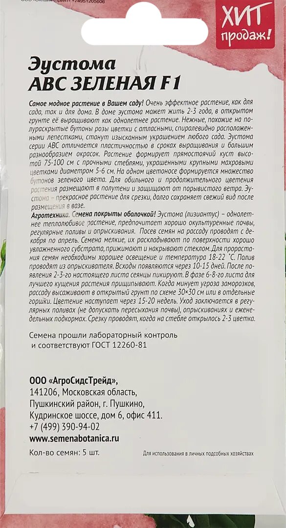 Сервис сравнения цен СкидкаГИД предлагает сравнить цены на товар «Семена цветов Агросидстрейд эустома Авс F1 зеленый 5 шт.»