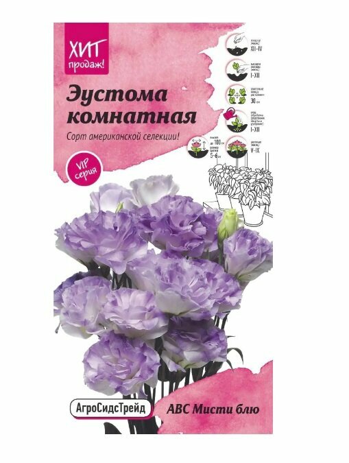 **Семена цветов Агросидстрейд эустома Авс Мисти Блю F1** выращивается как комнатное и садовое растение. Отлично смотрится в срезке в сочетаниях с другими цветами. Характеризуется длительным периодом вегетации. Посев семян — поверхностный. Период — с декабря по апрель. Грунт должен быть хорошо увлажнен. Подходящая температура для всходов — 20-25°C. После ее необходимо понизить до 20°C.