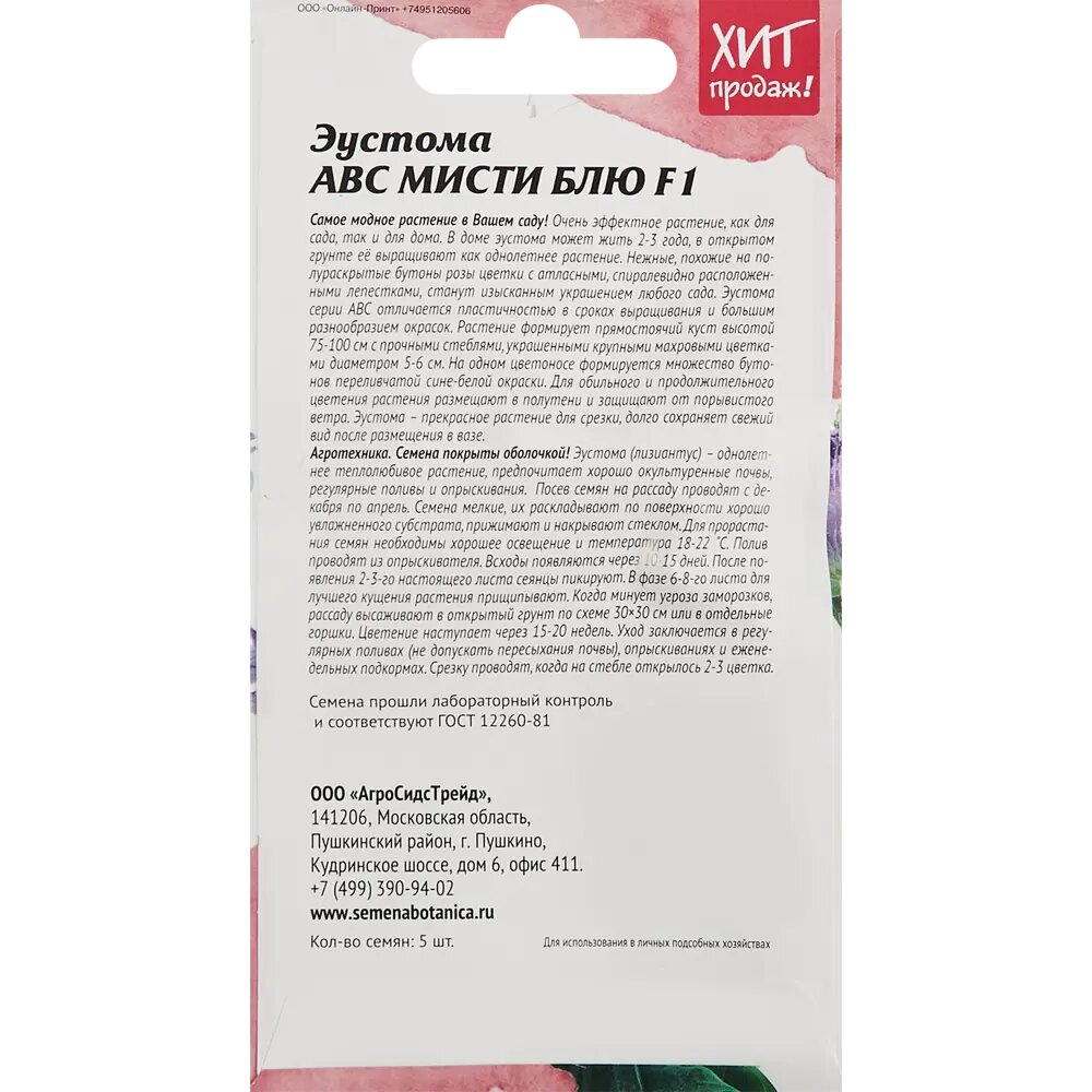 На сегодняшний день товар «Семена цветов Агросидстрейд эустома Авс Мисти Блю F1 5 шт.» можно купить с кешбеком в 1 магазине: Яндекс.Маркет