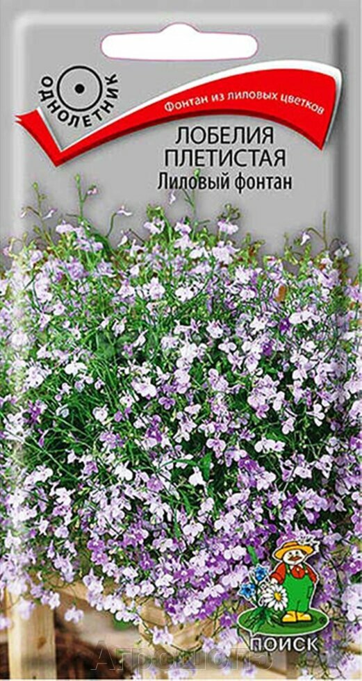 **Семена цветов Поиск лобелия плетистая Лиловый фонтан** — однолетнее цветущее растение, формирующие тонкие побеги. Они достигают до 0,35 м в длину. Необходима подготовка рассады. Для этого семена сажают в феврале или марте. В открытый грунт всходы пересаживают в мае. Эффектно смотрится в кашпо, вазонах, а также на балконе. Подходящий грунт — хорошо пропускающий воздух и плодородный.