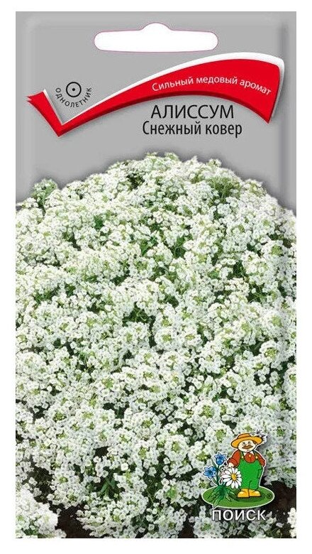 **Семена цветов Поиск алиссум Снежный ковер** — миниатюрное, компактное растение, высота которого не превышает 15 см. Цветы отличаются приятным медовым ароматом. Формирует плотный белый ковер. Листочки узкие. Хорошо откликается на санитарную обрезку — формирует новые бутоны. Растение предназначено для украшения рокариев, клумб, балконных ящиков.