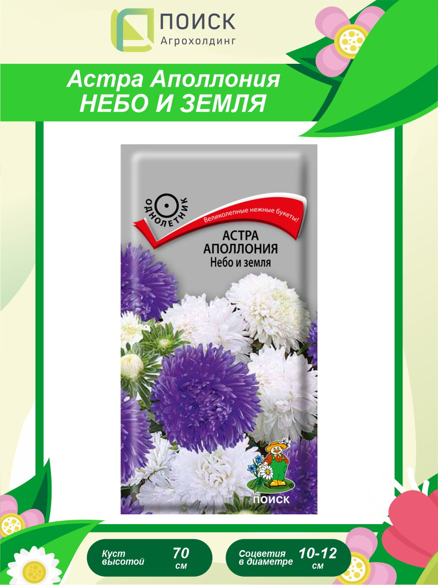 **Семена цветов Поиск астра Аполлония Небо и земля** могут высеваться в первой половине апреля для рассады. Применяются и для подзимнего посева. Посадка в открытый грунт проводится во первой половине мая. Кусты достигают 50 см в высоту, обладают колоновидной формой. Окраска — синяя с белым. На одном кустике вырастают до 8-10 соцветий.