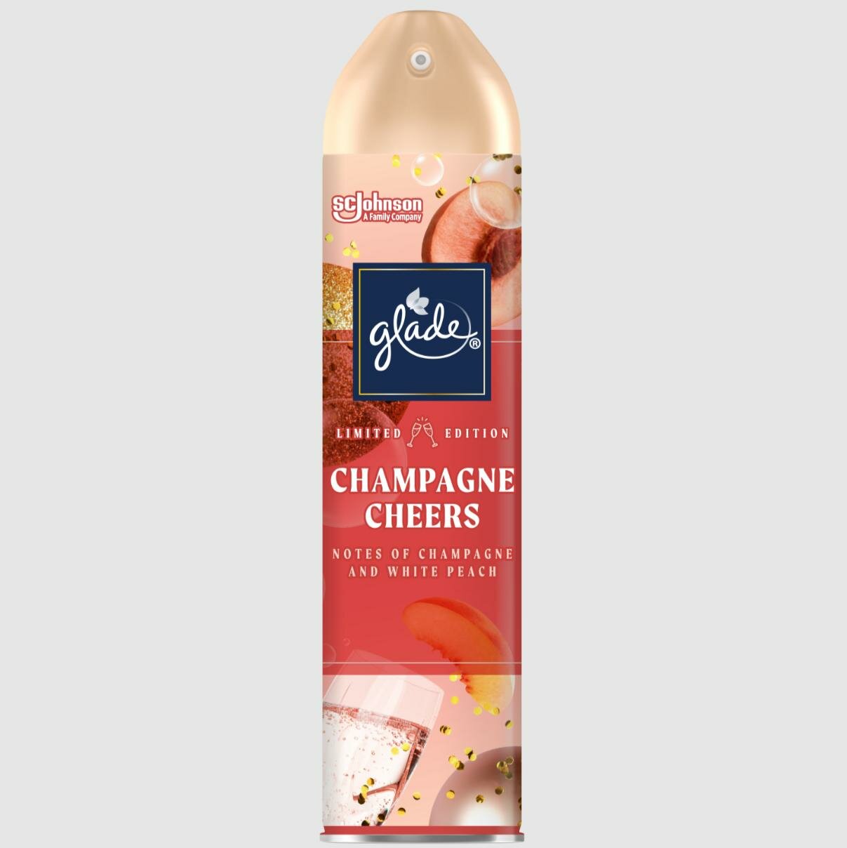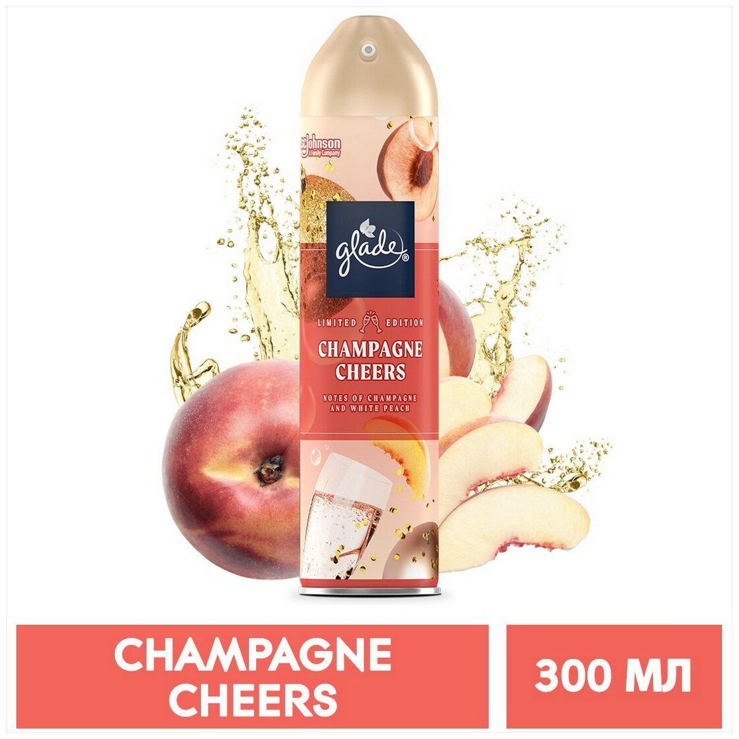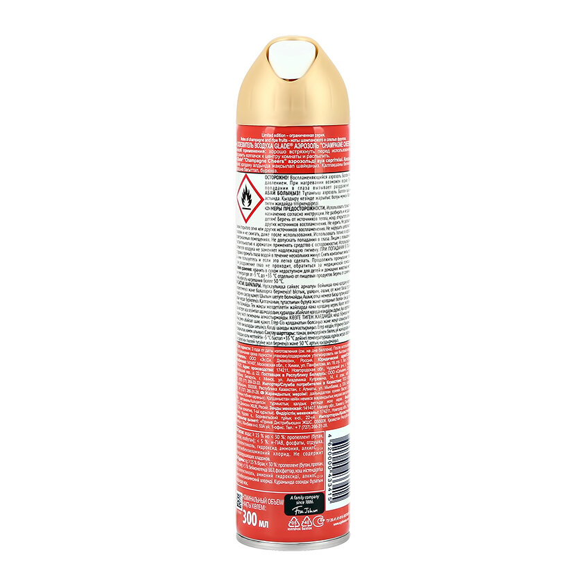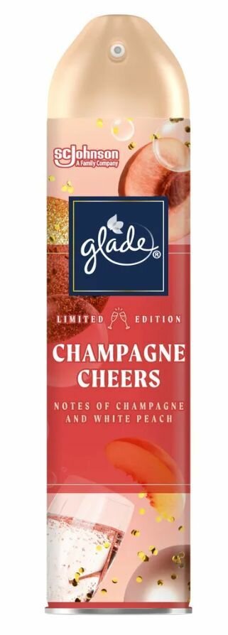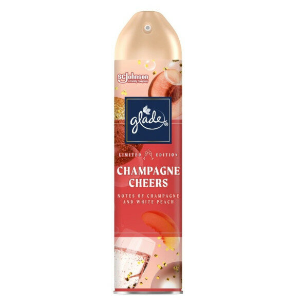 Освежитель воздуха GLADE CHAMPAGNE CHEERS Искрящийся и праздничный аромат шампанского с нотками белого персика в сочетании с соком личи, цитрусовыми и сливочным мускусом. Лимитированная коллекция. Аэрозоль действует мгновенно, устраняя неприятные запахи. Способ применения: хорошо встряхнуть перед использованием. Направить колпачок к центру комнаты и распылить. Осторожно! Воспламеняющийся аэрозоль. Баллон под давлением. При нагревании возможен взрыв. При попадании в глаза вызывает раздражение. Меры предосторожности: Использовать только по назначению согласно инструкции. Не разбирать и не давать детям! Беречь от источников воспламенения, нагревания, искр, открытого огня.