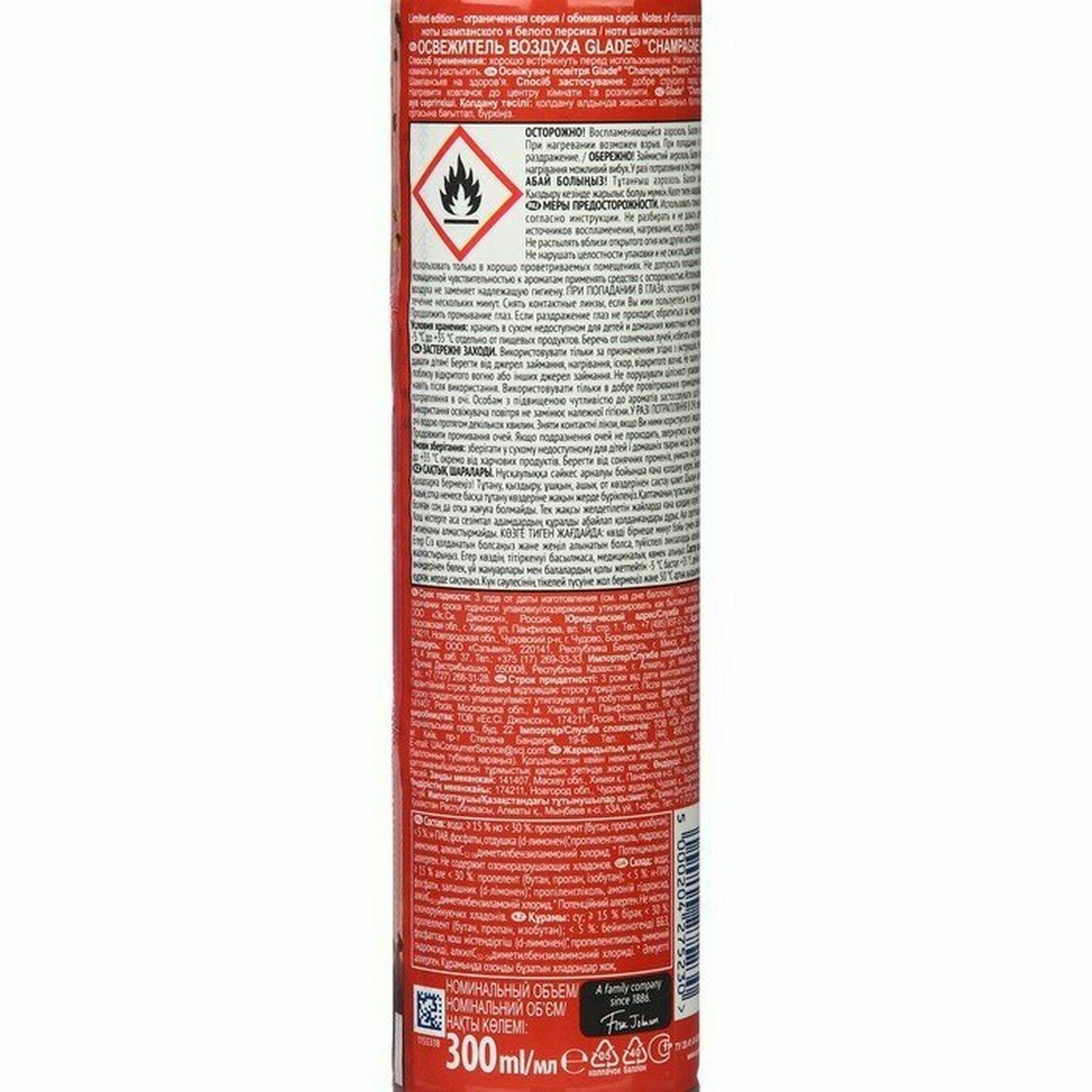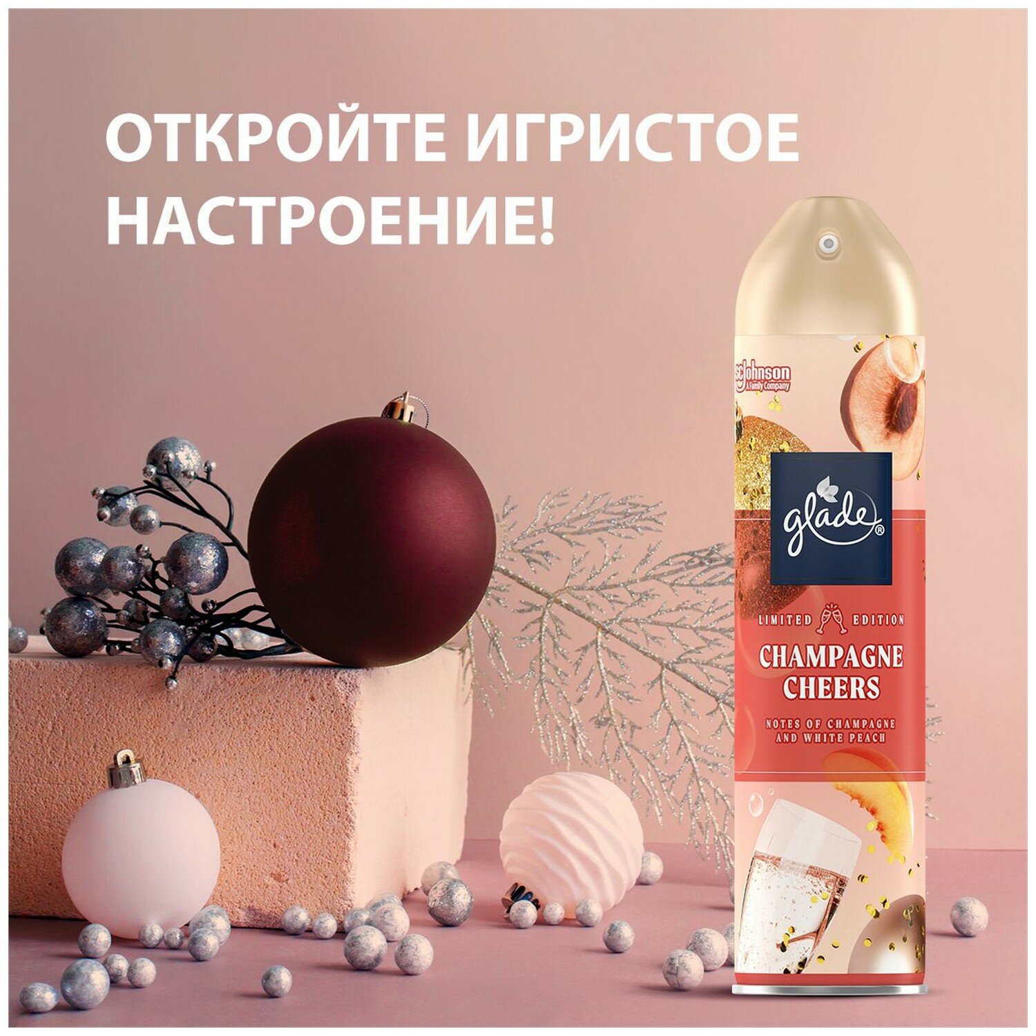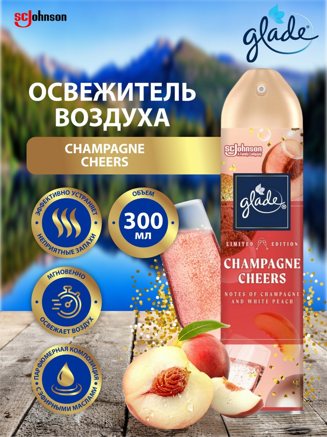 Освежитель воздуха GLADE CHAMPAGNE CHEERS Искрящийся и праздничный аромат шампанского с нотками белого персика в сочетании с соком личи, цитрусовыми и сливочным мускусом. Лимитированная коллекция. Аэрозоль действует мгновенно, устраняя неприятные запахи. Способ применения: хорошо встряхнуть перед использованием. Направить колпачок к центру комнаты и распылить. Осторожно! Воспламеняющийся аэрозоль. Баллон под давлением. При нагревании возможен взрыв. При попадании в глаза вызывает раздражение. Меры предосторожности: Использовать только по назначению согласно инструкции. Не разбирать и не давать детям! Беречь от источников воспламенения, нагревания, искр, открытого огня.